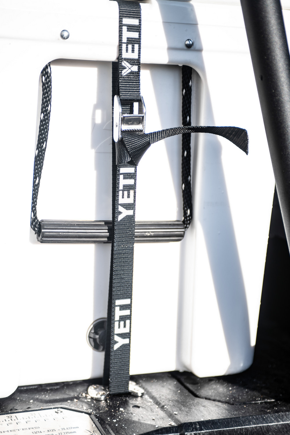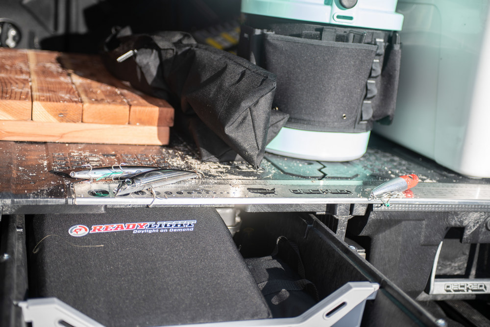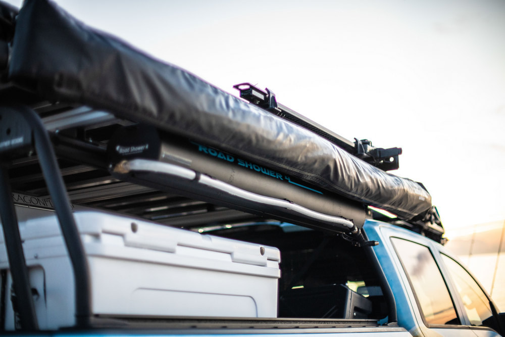 La estructura que cubre la caja de carga hace las veces de soporte para la tienda de campaña de techo de Freespirit, para el toldo Rhino-Rack Batwing y para la ducha integrada. También han colocado una cajonera en la caja de carga, para poder llevar todo organizado, sobre la que descansa una nevera Yeti de gran capacidad.