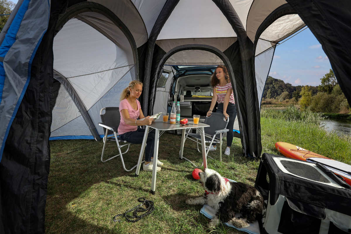 Aunque el interior de la Caddy California está bien aprovechado, por cuestiones de tamaño tiene límites, así que Volkswagen ha querido mejorar su versatilidad creando una tienda que puede utilizarse de manera independiente o conectarse a la furgoneta, creando espacio para que duerman otras dos personas, así como para montar un pequeño salón con la mesa y las sillas plegables que tiene la camper.