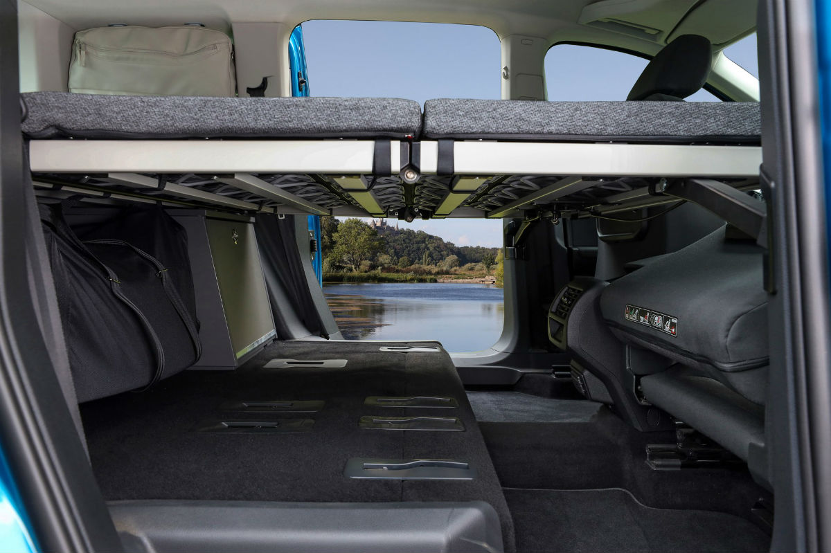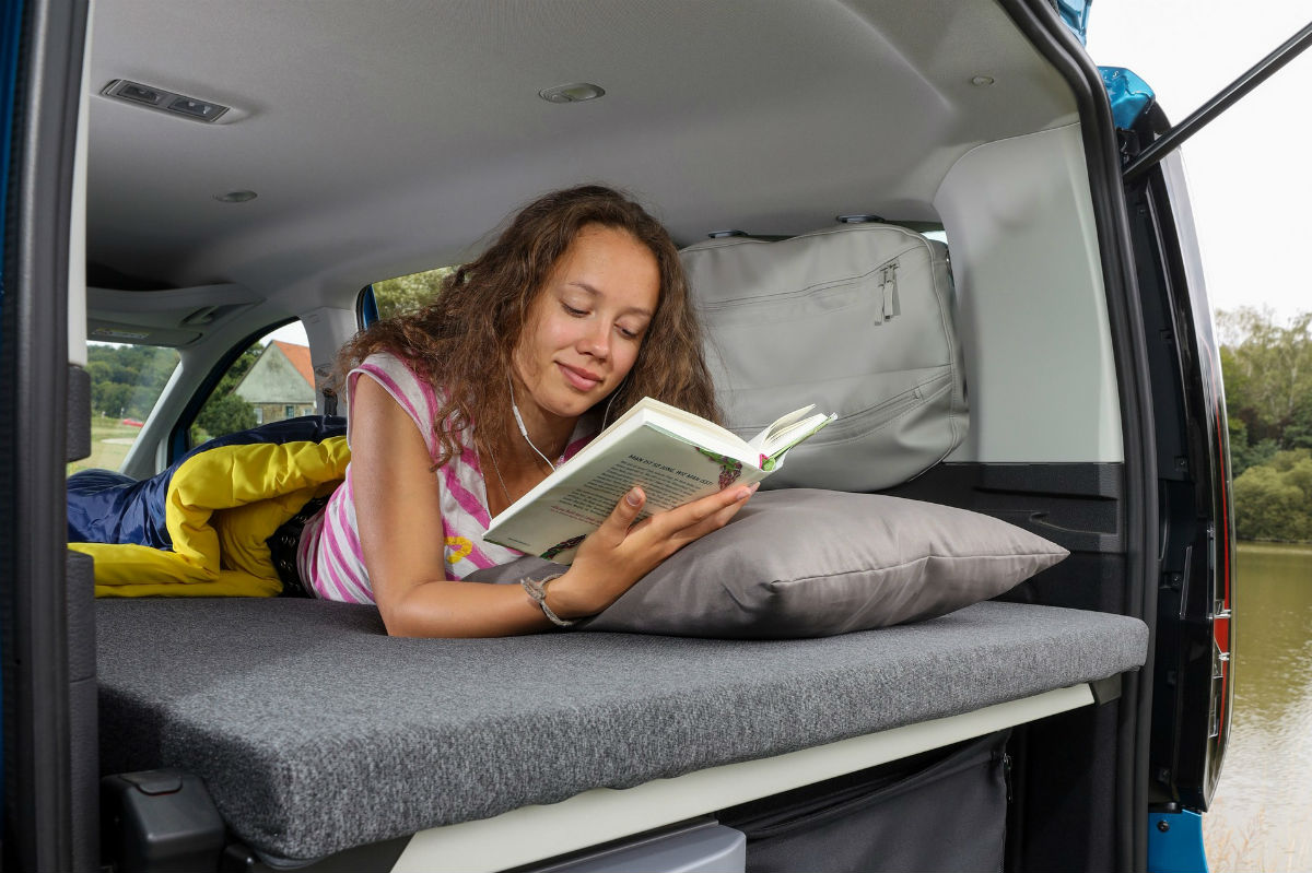 Desde el punto de vista estético, nada difiere de la Caddy convencional, pero todo cambia en el habitáculo. Lo más destacado es una gran cama plegable que mide 1.980 x 1.070 mm, por lo que pueden dormir dos personas y, cuando no se está utilizando, puede reducir su tamaño a un tercio, quedando colocada por encima del maletero. Además, gracias al techo panorámico opcional de 1,4 metros cuadrados se pueden ver las estrellas, mientras que por el día ayuda a iluminar todo el interior.