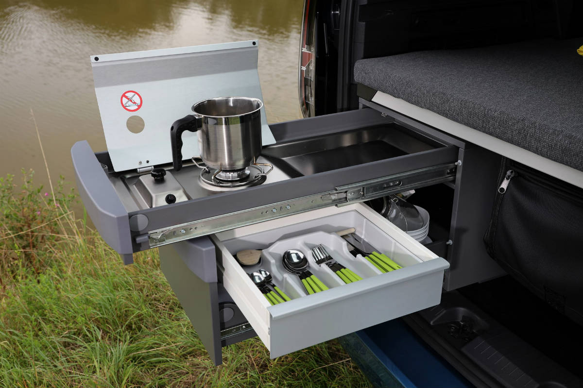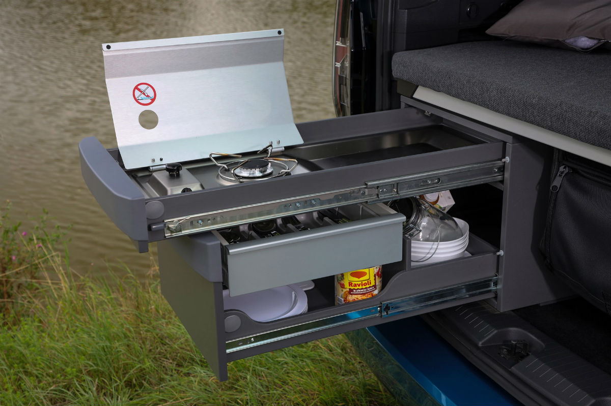 Para optimizar el espacio, se ha añadido un sistema de almacenamiento con bolsas para las ventanas traseras, con cada una pudiendo soportar hasta 5 kilos de peso; así como una cocina (opcional) situada en la parte trasera izquierda, que es extraíble y cuenta con la protección del portón al abrirse, para quien esté al fogón se pueda resguardar si, por ejemplo, está lloviendo.