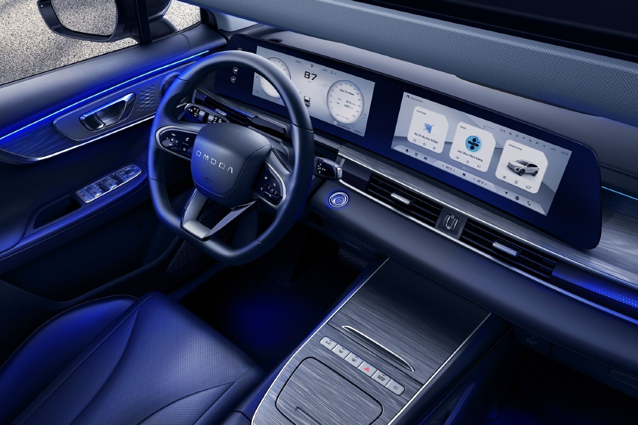 En el interior la compañía ha buscado asemejarlo al OMODA 5 EV, la versión eléctrica del modelo. Así, presenta una configuración de pantalla doble de 12,3 pulgadas cada una que dan forma a cuadro de instrumentos y consola central, apuesta por los mandos táctiles, cuenta con carga inalámbrica por inducción para teléfonos móviles y con tomas USB, USB-C y 12V.