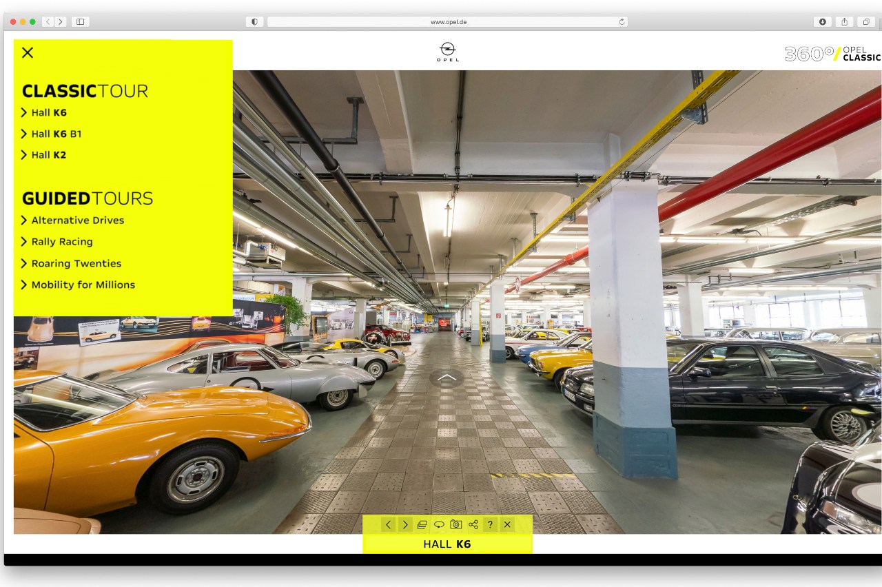 Llamada Opel Classic, la colección cuenta con cuatro tours temáticos: 'Propulsores alternativos', 'Rallies', 'Los felices años veinte' y 'Movilidad para millones'. Según cuál se elija, aparecen unos puntitos amarillos sobre determinados coches que nos cuentan su historia y características. Por ejemplo, en el primero están el RAK 2 de 1928, con un cohete de combustible sólido, o prototipos eléctricos pioneros, como el Impuls I de 1990. Y el último repasa la larga saga de 85 años del Kadett y el Astra.