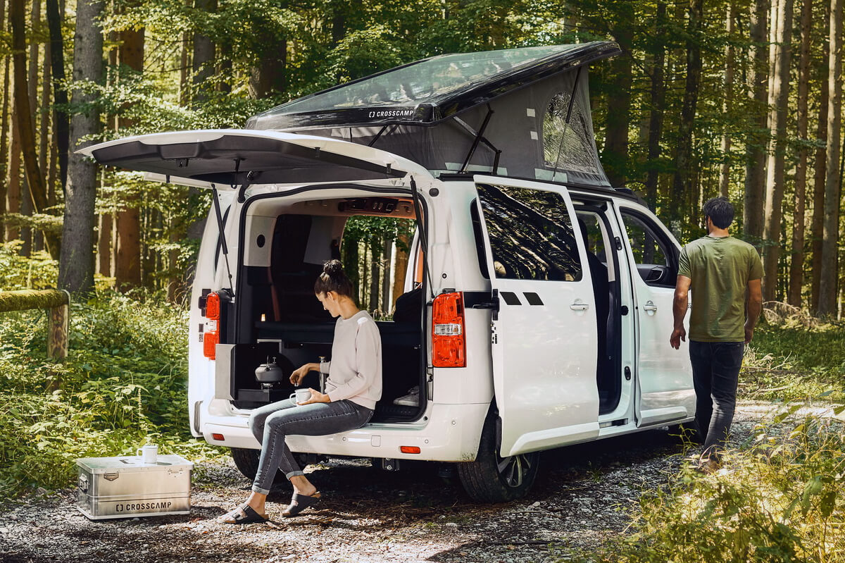 El equipamiento incluye una pequeña cocina de gas que se puede colocar en la parte trasera, espacio para almacenar una bombona de 1,8 kilos, hueco para la batería de la furgoneta y un contenedor de almacenamiento extraíble ubicado junto a la puerta corredera, que también se puede acoplar a la parte trasera del vehículo. Además, está disponible una nevera portátil de 13 litros, que se puede instalar entre los asientos delanteros.