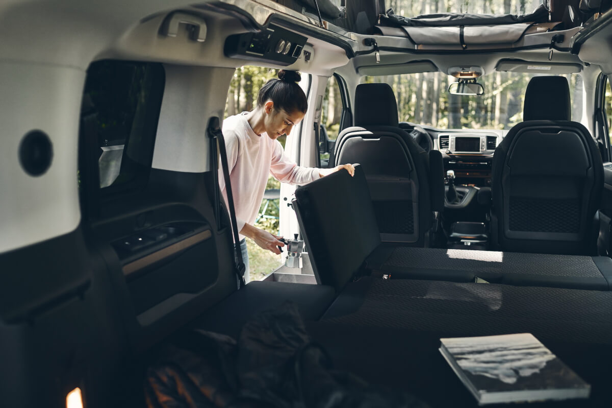¿Cómo han conseguido aprovechar el espacio de la Opel Zafira Life Crosscamp Lite? El banco que está ubicado detrás de los asientos delanteros puede convertirse en una cama de 140 × 200 centímetros. A esto hay que sumar dos camas más de 120 × 200 cm que se pueden colocar debajo de la cama estándar y del techo elevado.