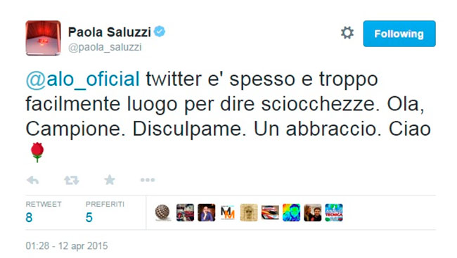 La periodista deportiva italiana del canal Sky Paola Saluzzi publicó un tuit en el que tildó a Fernando Alonso de “Arrogante, envidioso y pedazo de imbécil”. El mensaje escrito por este famoso rostro televisivo fue escrito el 10 de abril, día de los primeros libres del GP de China 2015, y posteriormente borrado tras el revuelo causado. “Le ha vuelto la memoria y se ha acordado de como es #arrogante #envidioso #pedazodeimbécil”, rezaba el tuit, que hacía referencia a la amnesia que sufrió el piloto tras su accidente en el circuito de Barcelona-Cataluña al poco tiempo de salir de Ferrari, escudería de la Paola que es una tifossi reconocida.