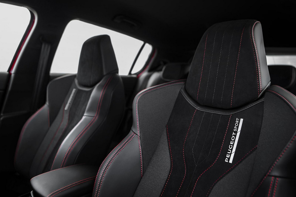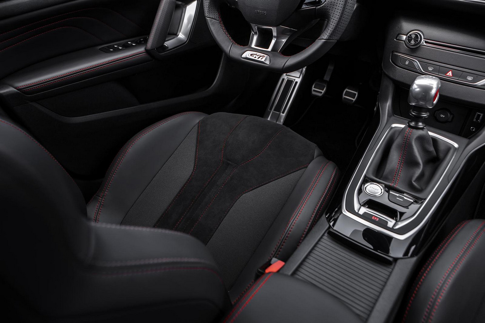 En el habitáculo, nos encontramos con multitud de detalles específicos, como puede ser el volante, los asientos de corte deportivo o las costuras de la tapicería en color rojo. Cuenta también con unas molduras de protección para el umbral de las puertas con la leyenda Peugeot Sport y GTi. Además, para la ocasión, la palanca de cambios y los pedales tienen un acabado de aluminio. La versión de 270 CV añade unos asientos delanteros tipo bucket con una tapicería mixta de cuero y Alcántara.