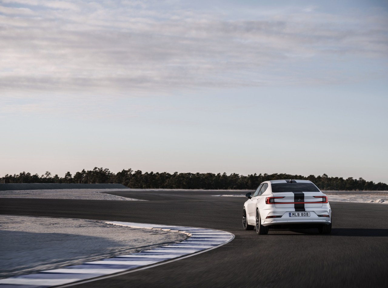 La versión de producción se parece al prototipo, aunque tiene un diseño de parachoques delantero algo menos agresivo. Aun así, obtiene la extensión aerodinámica para los paragolpes y las taloneras, una parrilla nueva y la franja opcional en negro mate que recorre la carrocería. Todo el conjunto reposa sobre llantas de aleación de 21 pulgadas pintadas en negro e inspiradas en el Polestar 1, con neumáticos Pirelli P Zero en medida 245/35 R21 desarrollados específicamente para este modelo.