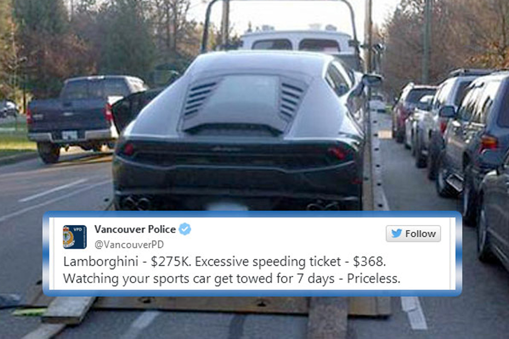 Horas después, te metes en Twitter y descubres con asombro un tweet publicado por la Policía de Vancouver dirigido a ti (aunque sin nombrarte) en el que puedes leer: “Lamborghini: 275.000 dólares. Multa por exceso de velocidad: 368 dólares. Ver cómo una grúa se lleva tu superdeportivo durante 7 días: no tiene precio”. A esto, en nuestro pueblo, se le llama vacilar.