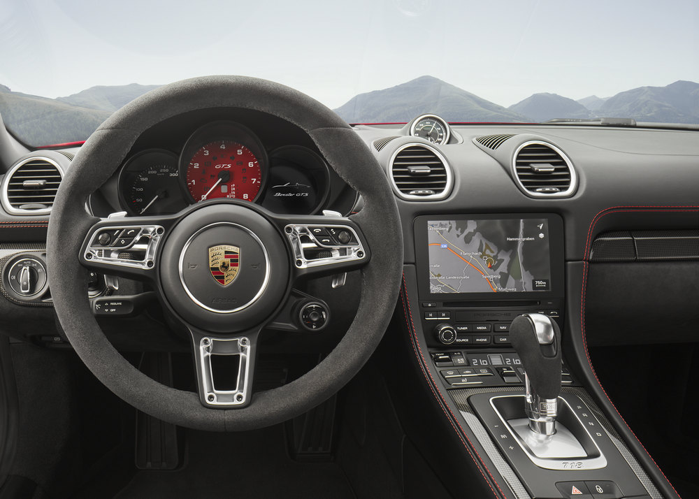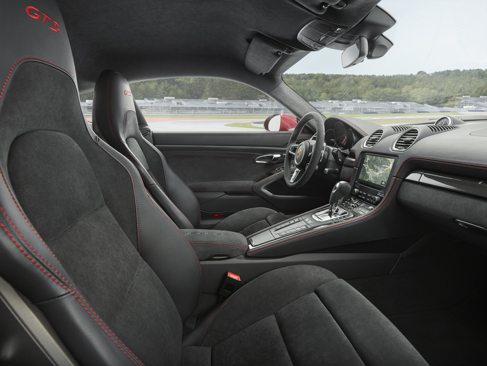 En el habitáculo, las variantes más deportivas de la gama del Porsche 718 incorporan unos asientos deportivos con la parte central tapizada en Alcantara de alta calidad (como sucede en todos los modelos GTS de Porsche), tejido que también podemos encontrar en el volante, en la consola central o en los reposabrazos. De serie equipan el paquete Sport Chrono y la aplicación para móviles Porsche Track Precision App (PTPA), que les permite grabar, ver y analizar los datos de conducción en su propio teléfono.