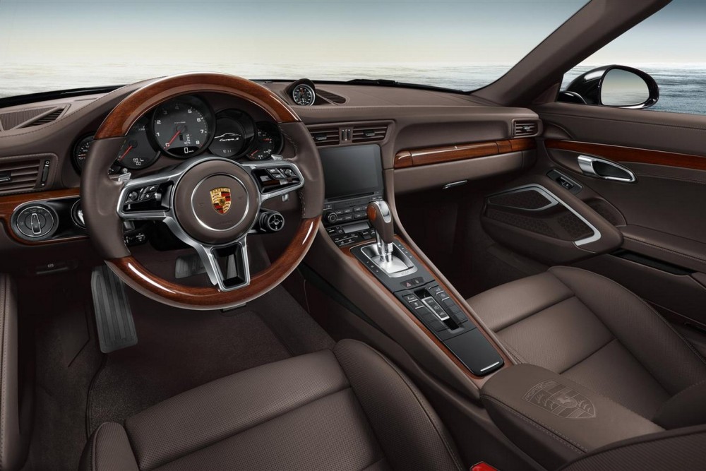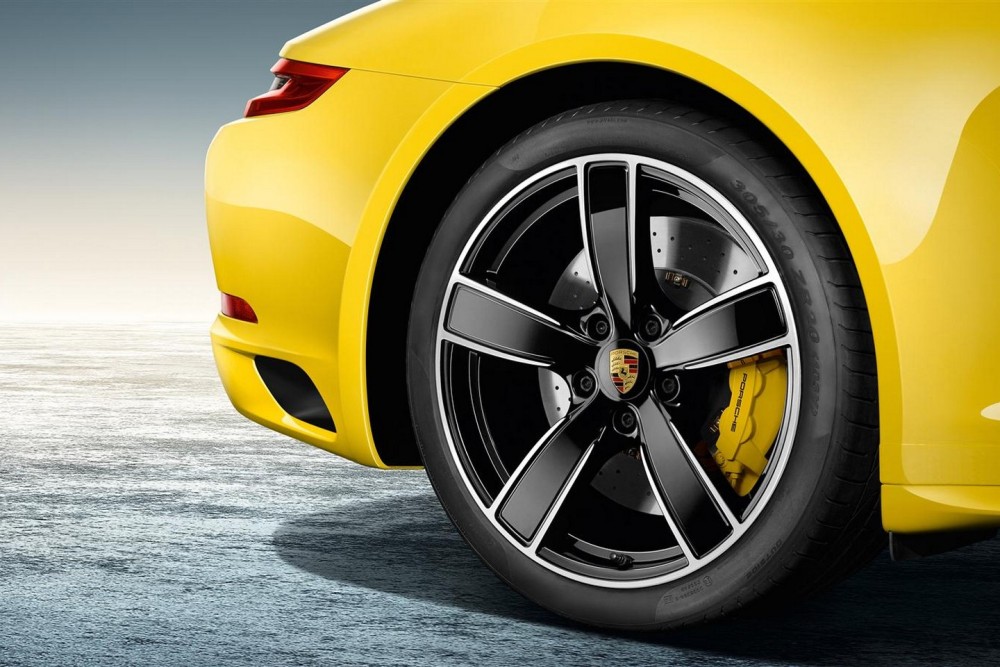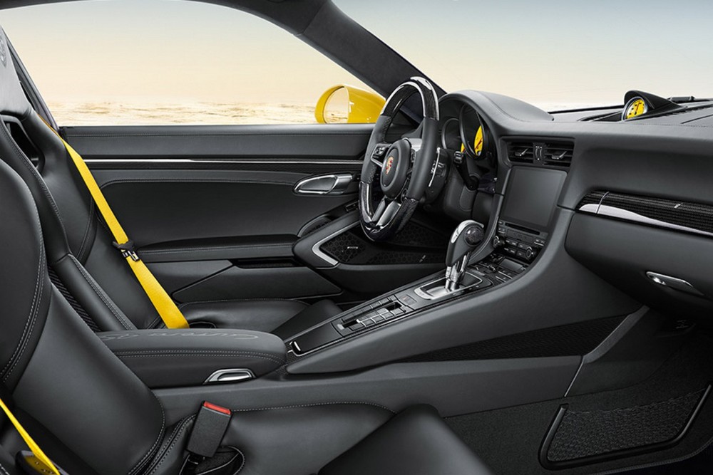 La lista de interesantes aditivos no termina aquí. El Porsche 911 2016 podrá ser equipado con un sistema de escape deportivo, cristales polarizados, logotipo Porsche en negro y la denominación del modelo. En el habitáculo encontramos acentos en Rancing Yellow para los asientos, el panel de instrumentos y el cronómetro Sport Chrono terminado en el mismo color que la carrocería. También está disponible un paquete opcional de carbono y un volante multifunción calefactado.