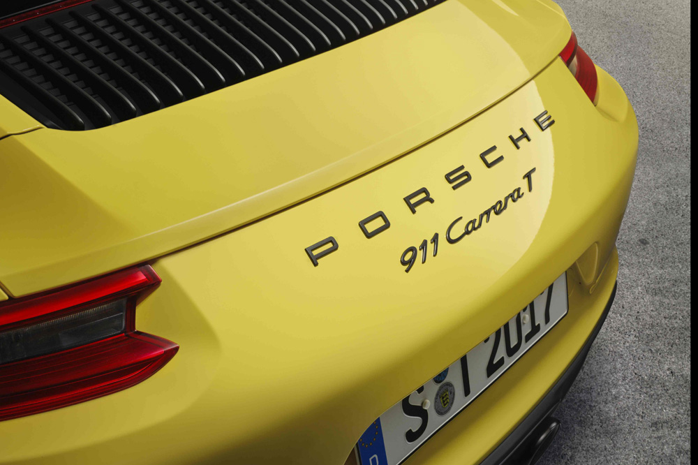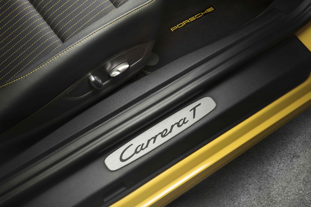 Visualmente, el 911 Carrera T se distingue del modelo en el que está basado en detalles como el faldón delantero, los retrovisores Sport Design, las llantas Carrera S de 20 pulgadas de diámetro, los pertinentes logotipos y adhesivos identificativos, una parrilla diferente sobre el motor o un sistema de escape deportivo con dos salidas centrales rematadas en negro. En total, hay nueve colores diferentes para la carrocería. En el habitáculo, nos encontramos con unos asientos deportivos en negro con la parte central tapizada con tejido Sport-Tex.
