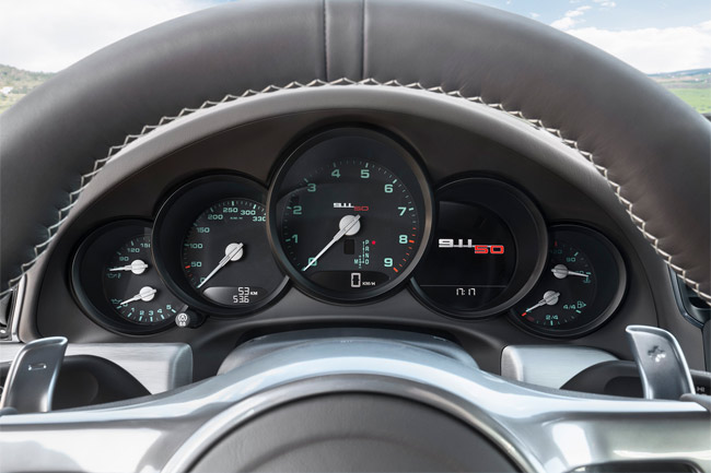 El capó trasero presenta un logotipo ‘911 50’ en dos tonos y con efecto 3D. Dicho logotipo también va bordado en tres colores en los reposacabezas de los asientos y aparece nuevamente en dos tonos en el cuentarrevoluciones y en las placas de aluminio del umbral de las puertas. ¿Y qué hay más de nuevo, viejo? Pues este Porsche 911 Edición 50º Aniversario equipa Porsche Active Suspension Management (PASM), la suspensión adaptativa con una puesta a punto especial, y el escape deportivo con un sonido más fuerte.
