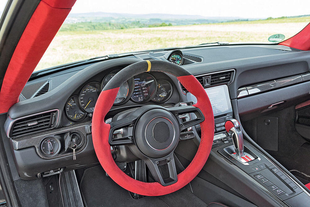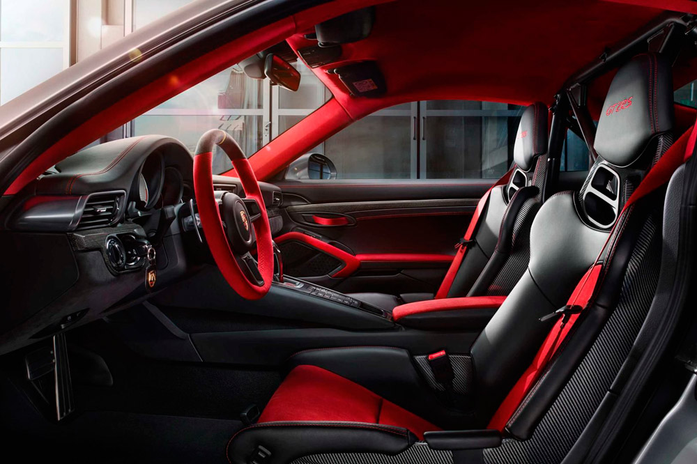 Lo mismo ocurre con el volante deportivo y el techo, que están tapizados en piel vuelta de color rojo. A pesar de ser uno de los coches perfectos para circuito, el Porsche 911 GT2 RS 2018 equipa el Porsche Communication Management (PCM), la unidad de control central para audio, navegación y comunicación. Incluye, también de serie, el módulo Connect Plus y la aplicación Porsche Track Precision, que permite registrar los datos de conducción en un smartphone. Como opción está disponible el Paquete Chrono, con el que a las funciones del PCM se suma un display de rendimiento, que se puede utilizar para mostrar, guardar y evaluar los tiempos realizados en la pista.