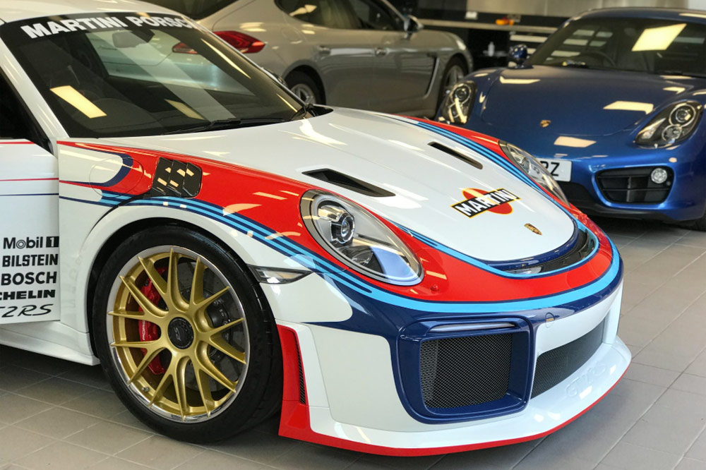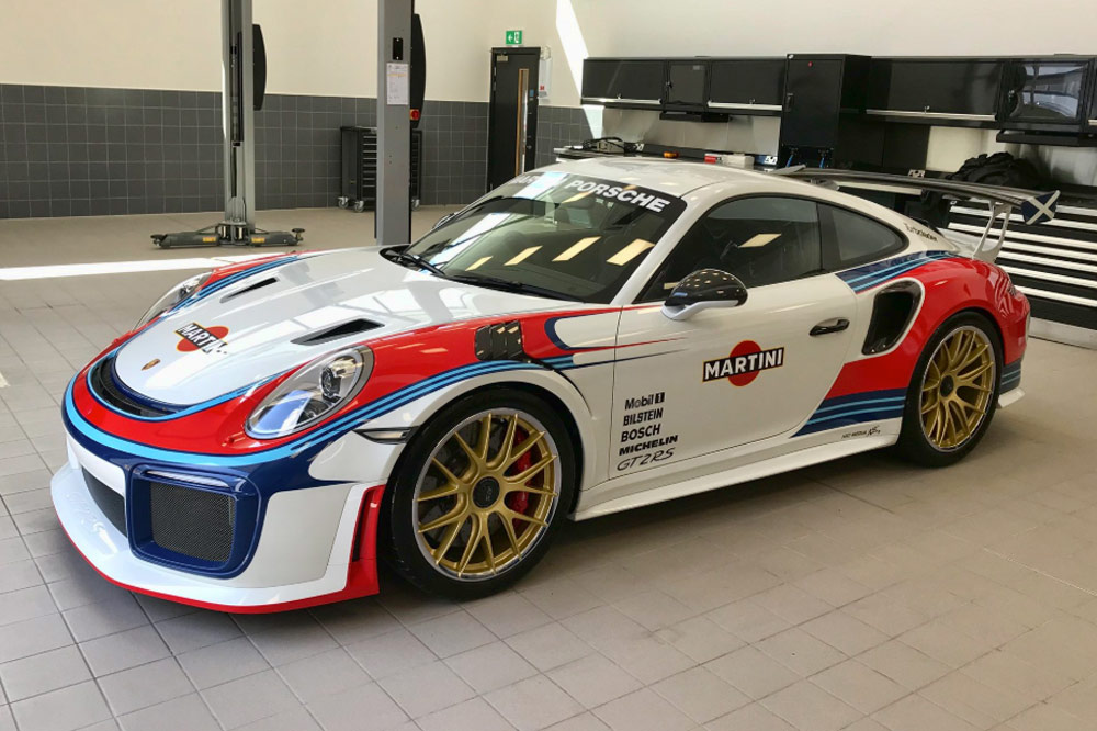 Con el blanco como tono principal, rojo, azul marino y azul claro se combinan para crear un diseño de lo más visual, dando prominencia tanto al frontal como a los pasos de rueda traseros. A esto se suman detalles propios del 911 GT2 RS 991, tales como las piezas realizadas en fibra de carbono (salidas de aire, carcasas de los retrovisores y alerón), y unas llantas doradas para conseguir un conjunto redondo.