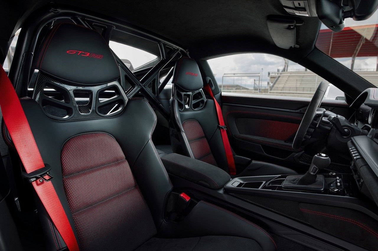 Por lo que respecta a su interior, el deportivo tiene un acabado en el típico estilo RS: cuero negro, tejido Racetex y detalles de acabado en carbono caracterizan el ambiente de competición. El 911 GT3 RS está disponible con el pack Clubsport sin coste adicional. Esto incluye una barra antivuelco de acero, un extintor contra incendios manual y arneses de seguridad de seis puntos para el conductor.