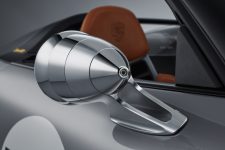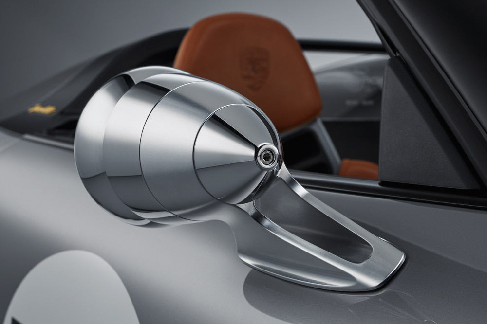 También llama la atención en este Porsche 911 Speedster Concept algunos elementos como la tapa del depósito de gasolina al estilo años 50, situada en mitad del capó delantero; o la clásica forma Talbot de los retrovisores exteriores (imagen). El detalle más curioso del prototipo quizá sean los grupos ópticos delanteros, que producen un efecto entrelazado (imagen) y emulan a una práctica habitual de los primeros años de Porsche en competición -los faros se encintaban antes de las carreras para protegerlos de las piedras sueltas y evitar que la tulipa se rompiera-. Tampoco pasan desapercibidos los ganchos del capó y las letras Speedster en dorado alojadas en el pilar B y la trasera. Las llantas de 21 pulgadas con diseño Fuchs, que por primera vez son monotuerca, tienen un pulido de alto brillo, y el sistema de escape finaliza en unos tubos realizados en titanio.