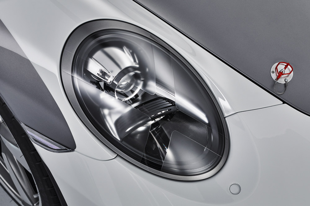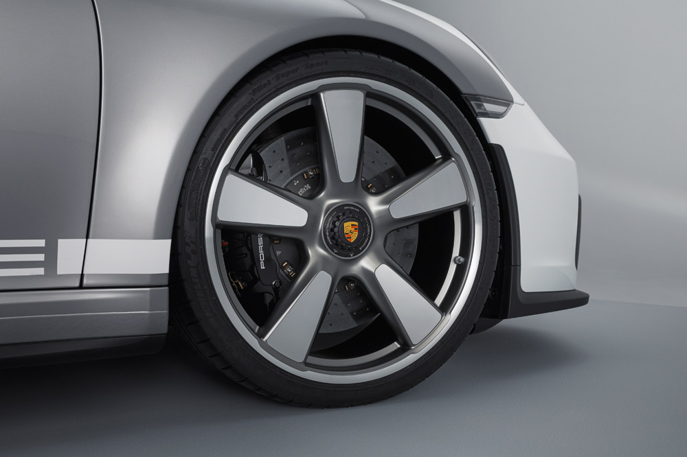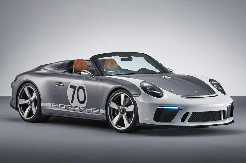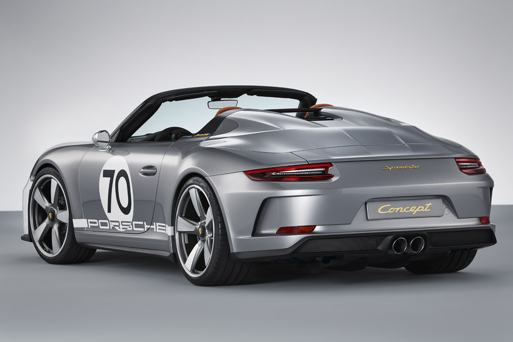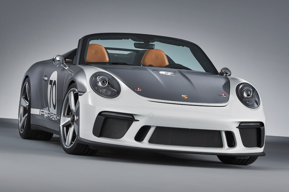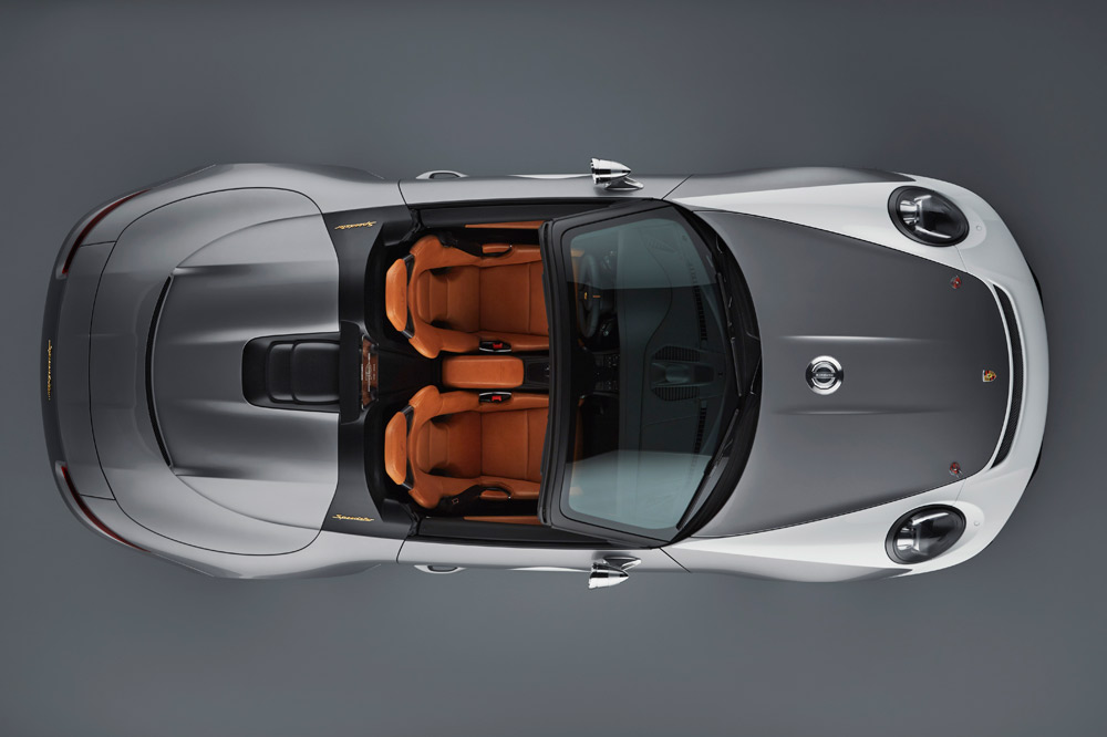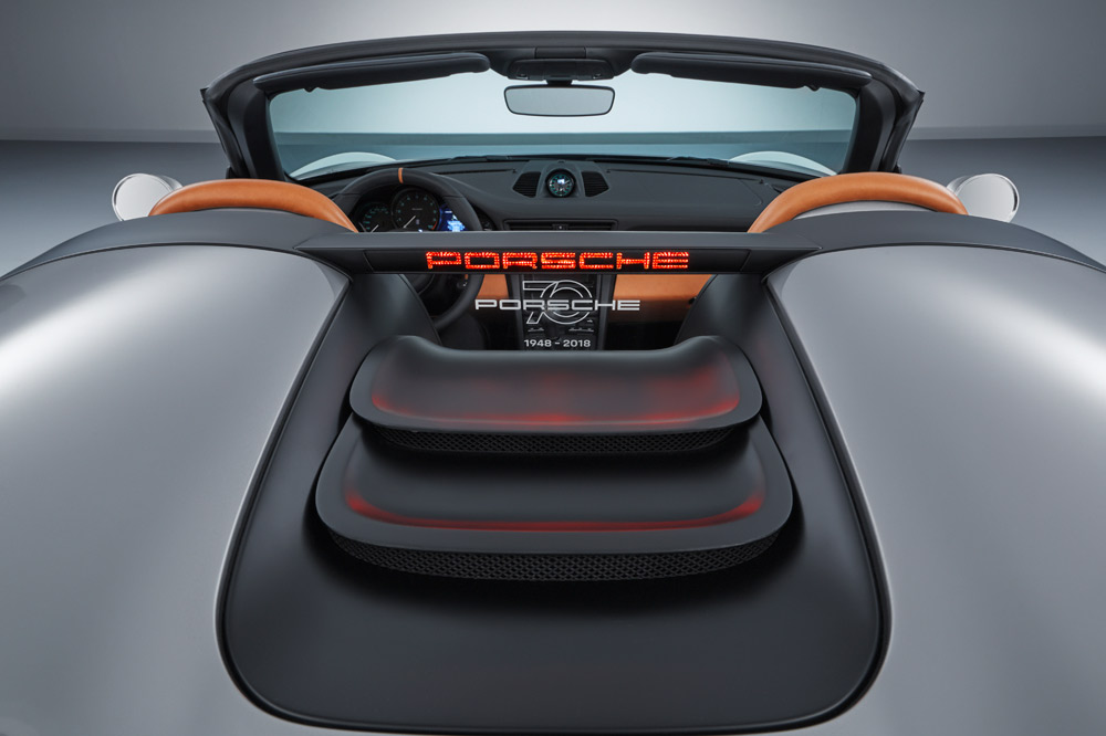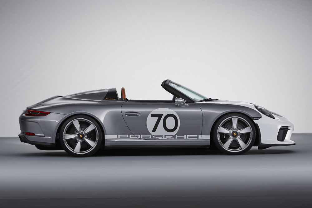 El nuevo estudio de diseño está caracterizado por equipar un marco del parabrisas más corto e inclinado, unas ventanillas laterales más bajas y por adoptar una carrocería bitono -Plata y Blanco de los GT, como en los primeros coches de competición-. Otro elemento diferenciador es la cubierta especial tipo doble cúpula de las protecciones antivuelco que inició en 1988 el 911 Speedster. Está realizada en fibra de carbono y las burbujas, unidas por dos lamas negras y un deflector de viento transparente con el logotipo “70 Jarhre Porsche Sportwagen” grabado.