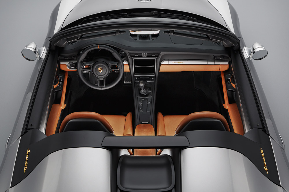 Asimismo, la capota ha sido sustituida por una ligera cubierta de lona que se encarga de cubrir solo el interior del habitáculo para cuando, aparcado, comienza a llover -se fija utilizando ocho cintas Tenax-. Los elementos prescindibles que incrementen el peso del conjunto han sido eliminados: sistemas de navegación, audio y climatización. Siguiendo la máxima del mínimo peso se han instalado unos bacquets hechos de carbono, que van tapizados en cuero Aniline Marrón Claro como guiño a sus antepasados. Otras medidas para reducir kilogramos han sido la de utilizar material composite de fibra de carbono en las aletas, el capó delantero y la cubierta trasera del 911 Carrera 4 Cabriolet -el chasis es del Porsche 911 991.2 GT3 (prueba)-, modelo que ha sido utilizado como base.