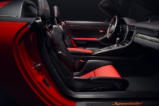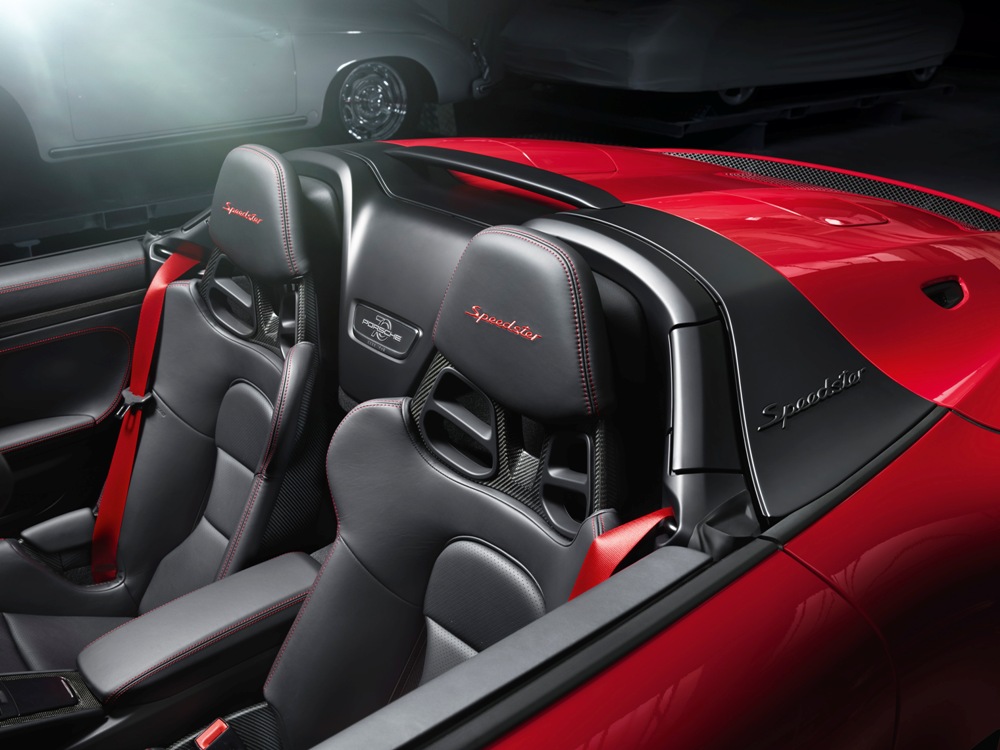 En el interior del Speedster 2019 destacan elementos como el cuero negro, los bucket de fibra de carbono, logotipos específicos, un cuadro de instrumentos personalizado y placas de edición limitada. Porsche ofrece opcionalmente el paquete Heritage Design (24.679 euros) creado por Style Porsche y realizado por Porsche Exclusive Manufaktur, e incluye elementos como el interior en negro y cognac con detalles en oro.