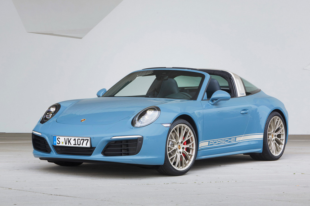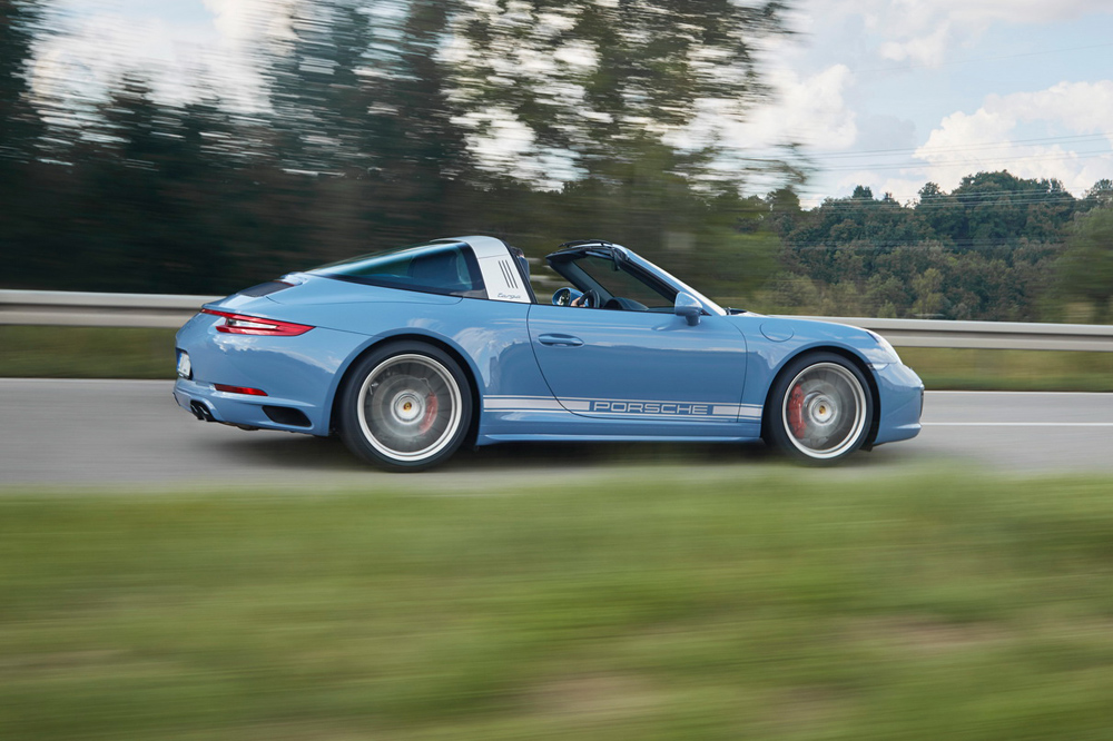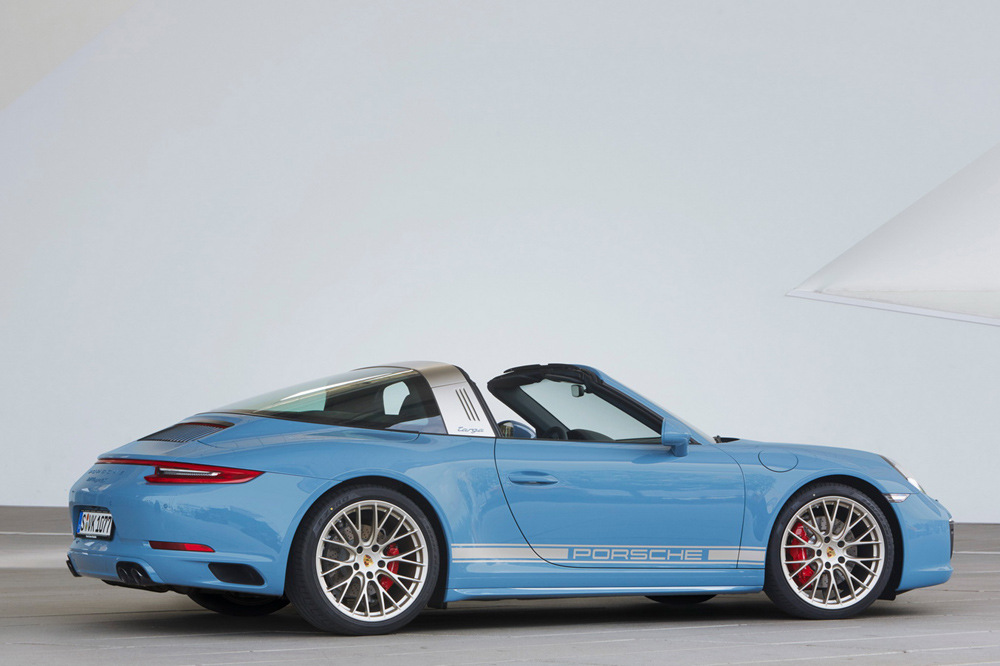 Esta nueva obra se caracteriza por los guiños que hace a algunos modelos pasados de Porsche. Cabe señalar el color Azul Etna de la carrocería, usado en los Porsche 356 B T6 de 1960 y 1961, que cubre todos los logotipos del vehículo -en el alerón, pilar b y cubierta del motor-. Para combinar con este ‘Etna Blue’ se ha elegido el ‘White Gold Metallic’, que cambia de tono según la incidencia de la luz. Es adoptado en las bandas de los flancos del coche, utilizadas en los 911 de los 70 y 80, y en las llantas de aleación, unas RS Spyder de 20”. No podemos pasar por alto los grupos ópticos LED oscurecidos y las molduras de los umbrales de las puertas que están realizadas en acero inoxidable, pintadas en negro anodizado y con ‘Porsche 911 Targa 4S Exclusive Design Edition’ grabado.