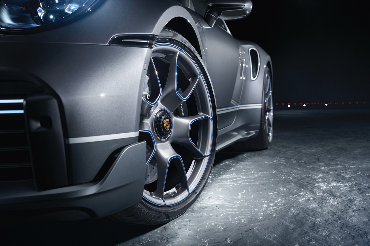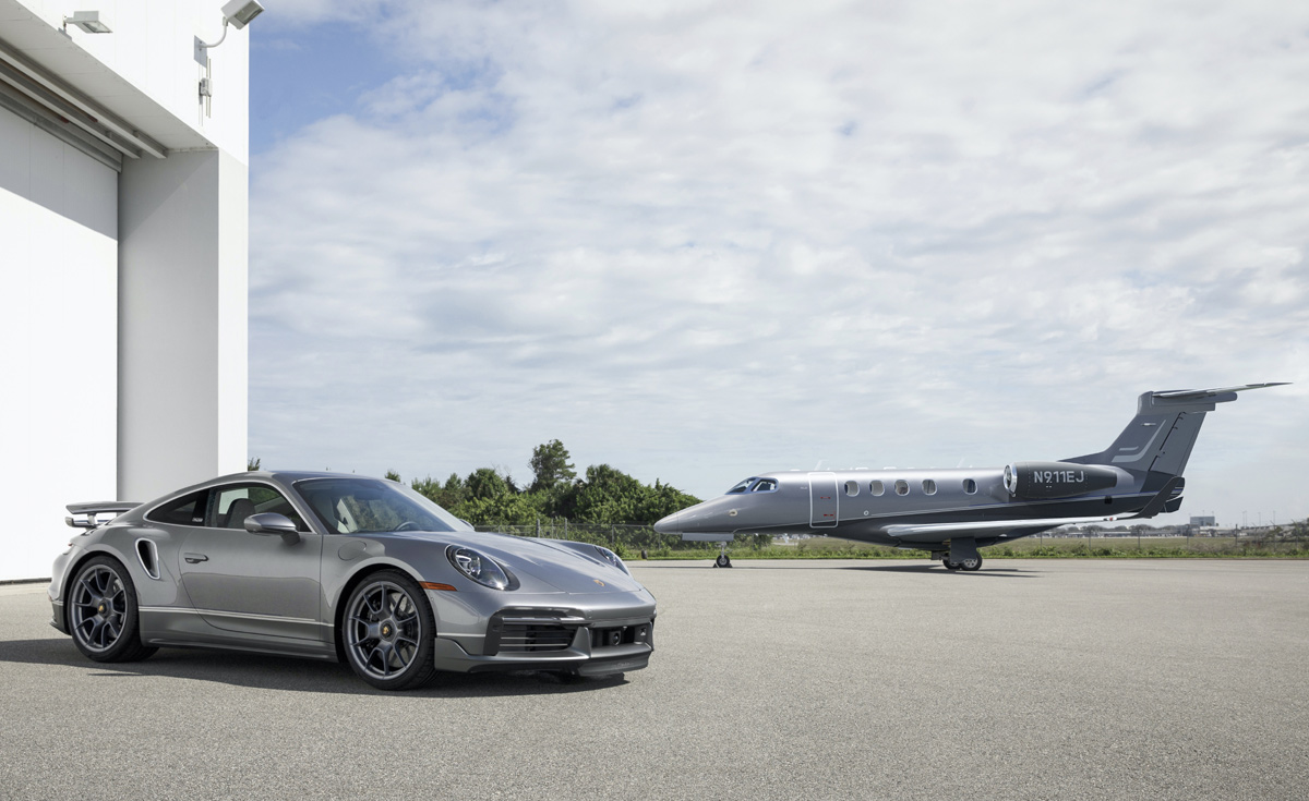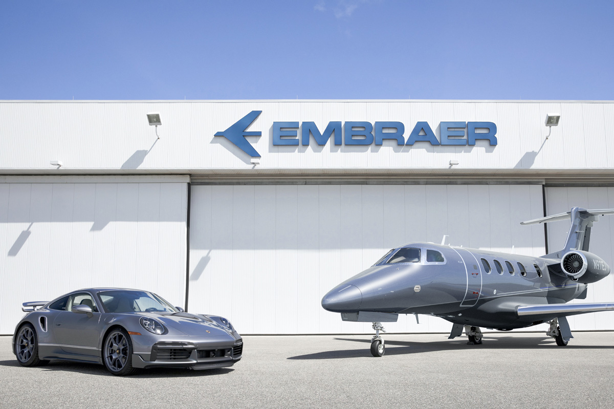 Tanto el Porsche 911 Turbo S ‘Duet’ como el Embraer Phenom 300E lucen un color “gris jet” metalizado, con una moldura que recorre los laterales y las puertas en cromo brillante y “azul speed”. Es la primera vez que Porsche ha combinado pintura brillante con brillante satinada, ya que la parte superior del superdeportivo está acabada en platino metalizado y la inferior en ese “gris jet” metalizado. Las llantas de diseño Exclusive están acabadas igualmente en platino metalizado y lucen una pequeña línea azul en el borde.