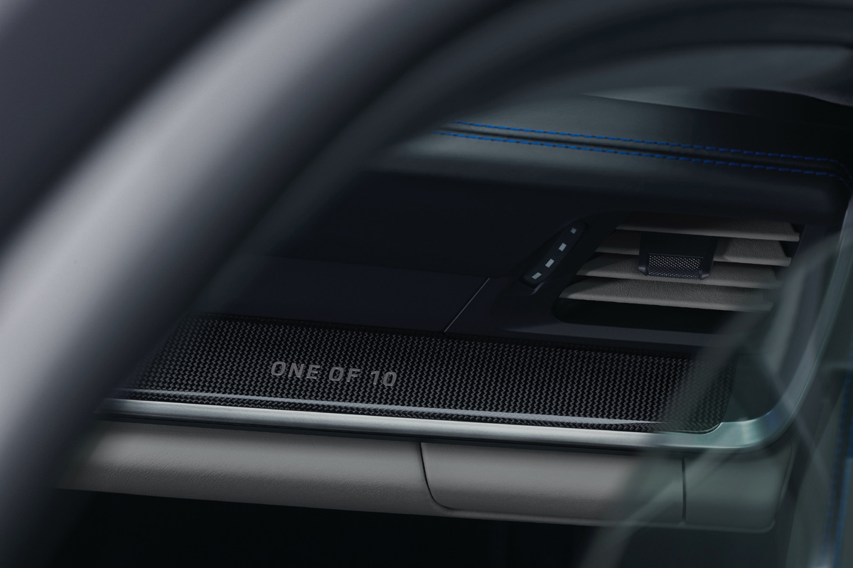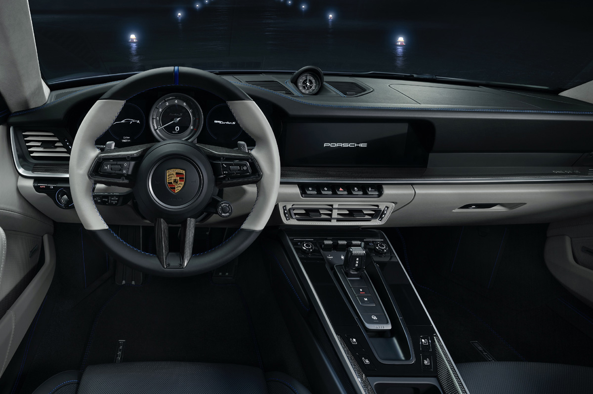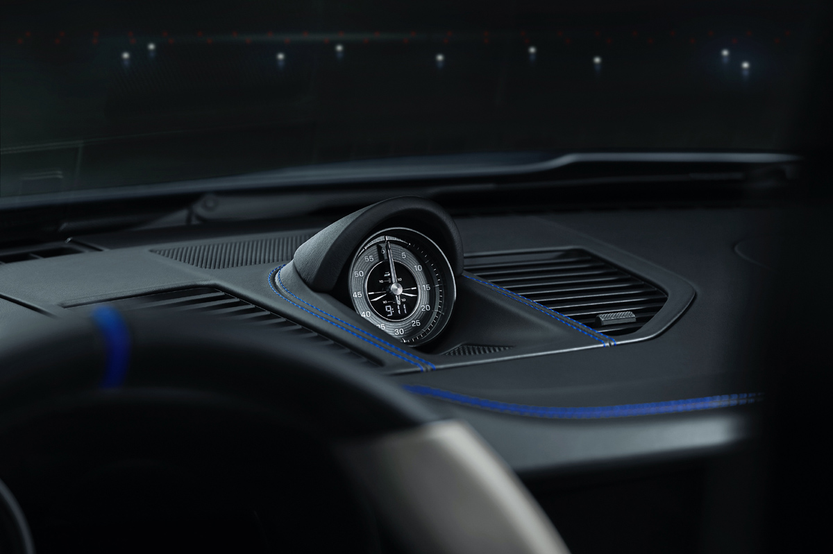 En cuanto al interior, es un espacio que se inspira en la cabina del avión y que combina tonos negro y tiza en el tapizado de cuero. Estos colores también están presentes en el resto del habitáculo, que cuenta con pack interior de carbono brillante y una selección de materiales y acabados que no está disponible para ningún otro 911. Llaman la atención la moldura del umbral de la puerta, con la inscripción “No Step” iluminada en rojo, y la esfera del reloj del Sport Chrono, que tiene un horizonte artificial impreso que imita el diseño de la instrumentación de la aeronave.