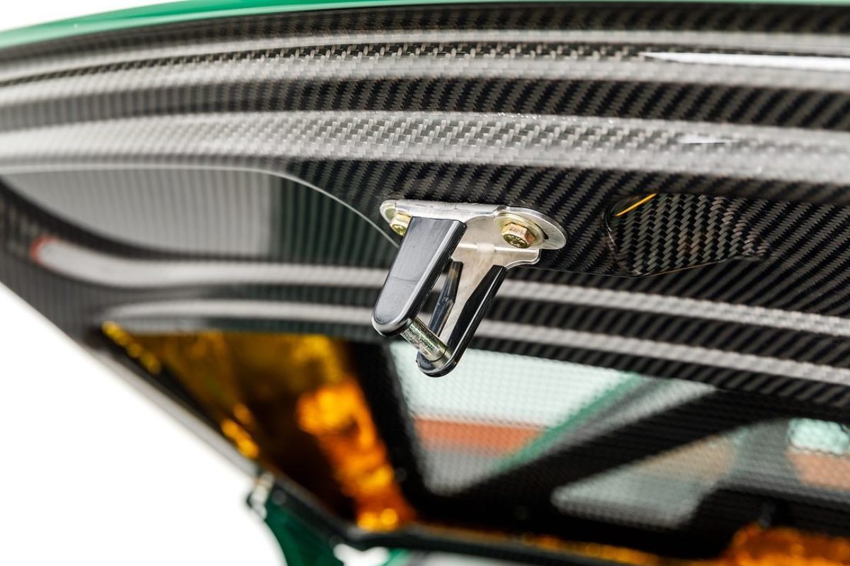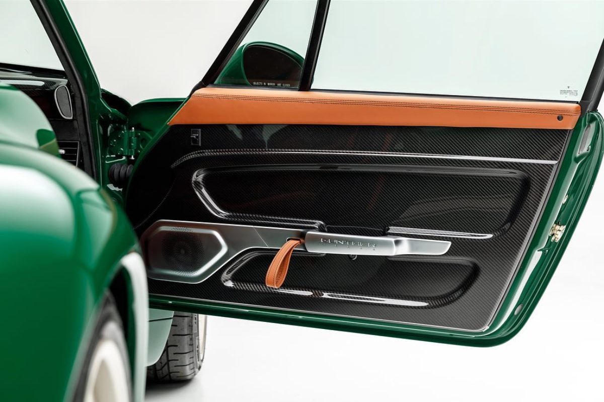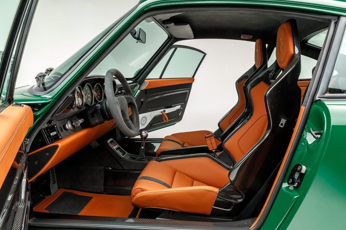 Comenzando por la carrocería, encontramos el color Irish Green que combina a la perfección con las líneas suaves y redondeadas de esta generación del Porsche 911 -conoce su historia-, especialmente con los anchos guardabarros traseros. El preparador ha dejado expuesta la fibra de carbono en un par de rayas longitudinales y en el techo. También hay franjas de color dorado a lo largo del lateral y las llantas de cinco radios presentan este mismo color a juego.