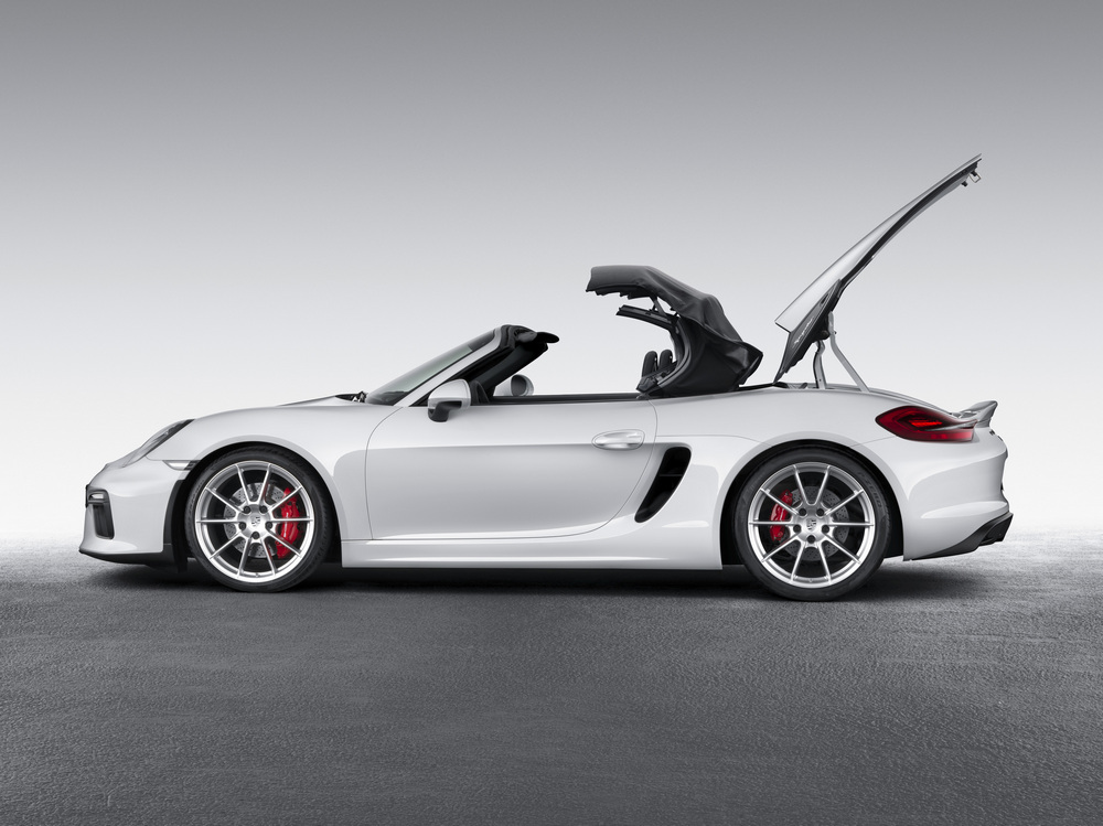 ¡El Porsche Boxster Spyder 2015 ya es oficial! Tras unas semanas de rumores y fotos espía, Porsche ha decidido presentar la versión definitiva de producción del (prueba) Porsche Boxster más radical hasta la fecha en el Salón de Nueva York 2015, un evento que ha abierto hoy sus puertas. Más ligero y potente que sus hermanos de gama, este biplaza comparte motorización con el Porsche Cayman GT4 (y este a su vez con el 911 Carrera S).