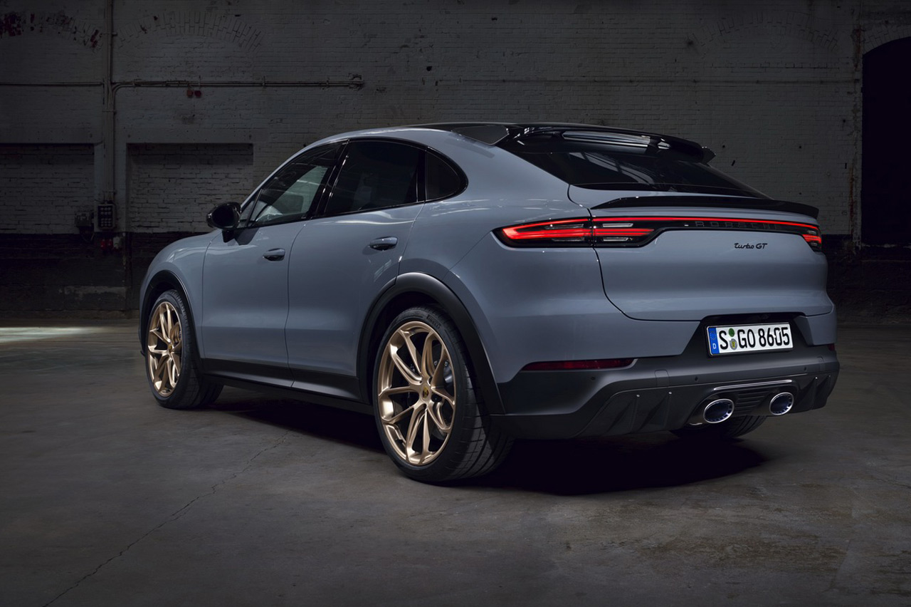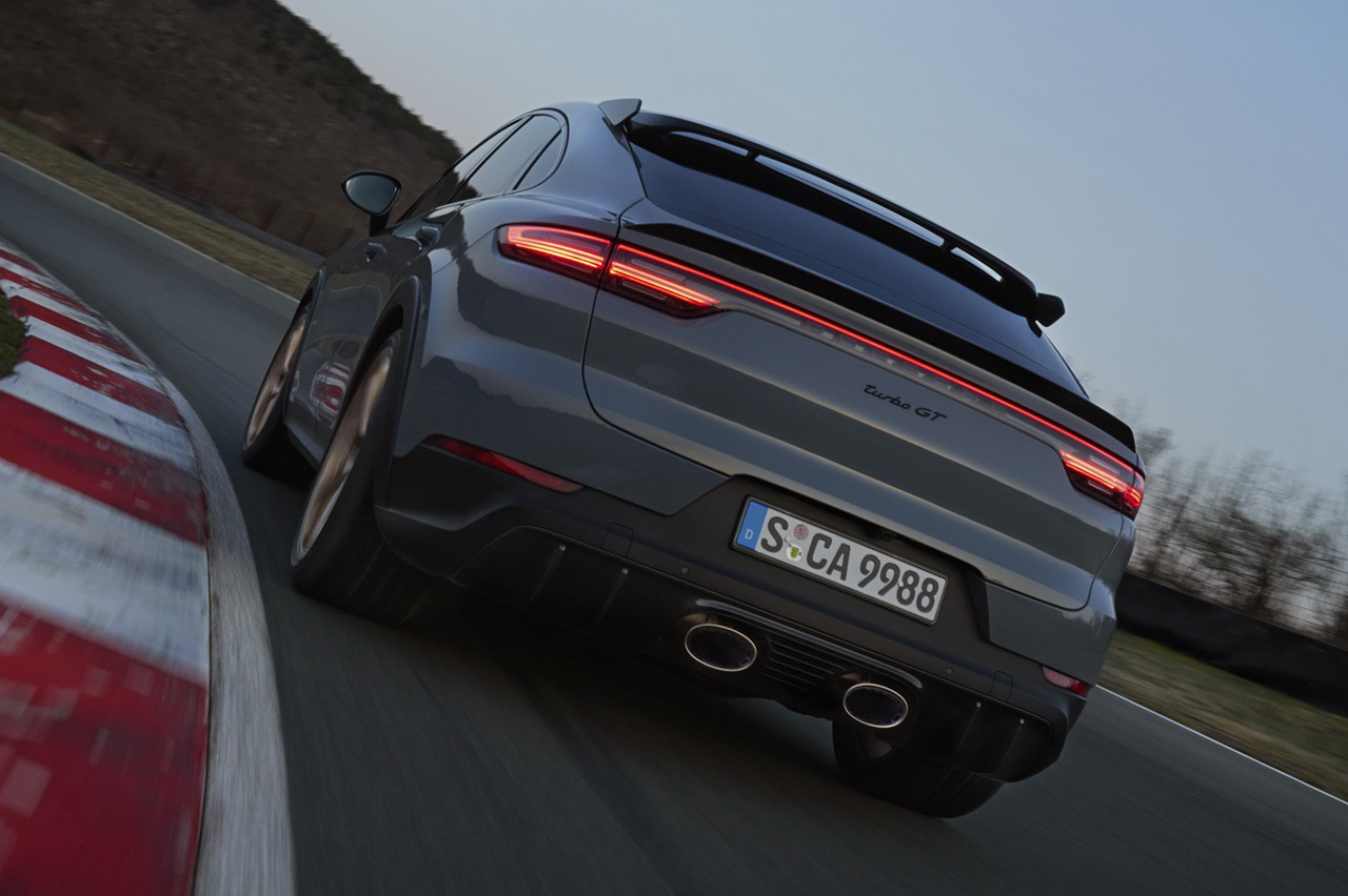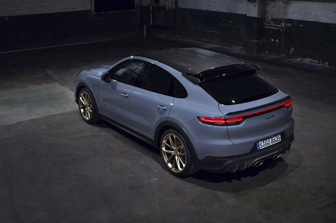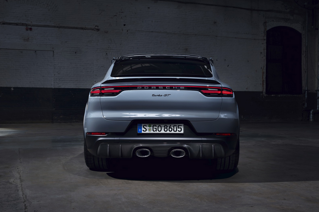 A nivel estético, el Porsche Cayenne Turbo GT se diferencia gracias a un faldón delantero específico, con un labio inferior más llamativo y unas entradas de aire más grandes en el parachoques. El techo es de fibra de carbono y las aletas presentan unas extensiones negras para dar cabida a unas llantas de aleación GT Design de 22 pulgadas de diámetro. Otro elemento único del GT son las extensiones laterales del alerón de techo o el labio adicional de 25 mm que lleva el spoiler retráctil. Con estos dos últimos elementos logra hasta 40 kg de carga aerodinámica a 300 km/h.