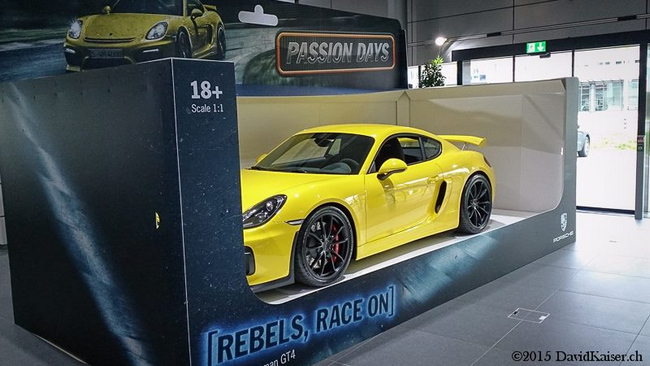Porsche Zurich, el concesionario que la marca alemana tiene en la ciudad suiza, presenta a sus clientes el Porsche Cayman GT4 como si fuera un coche de juguete a escala 1:1. El deportivo de motor central y 385 CV que debutó el pasado mes de febrero en el Salón de Ginebra 2015, apareció expuesto en el concesionario en el interior de una caja de cartón de dimensiones colosales, tal y como si se tratara de una reproducción a escala del modelo original.