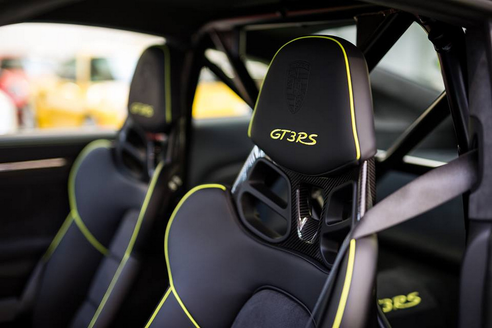 Pero esas no son las únicas características que hace que este 911 GT3 RS nos parezca brutal, esta unidad luce también unas llantas de aleación monotuerca, de 20 pulgadas en el tren delantero y de 21 en el trasero, rematadas en negro mate. Y si nos subimos a su habitáculo, descubrimos unos asientos de tipo baquet idénticos a los que podemos encontrar en un Porsche 918 Spyder, que para la ocasión, lucen costuras y ribetes en color de contraste y a juego con la tonalidad escogida para la carrocería.