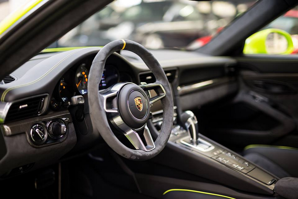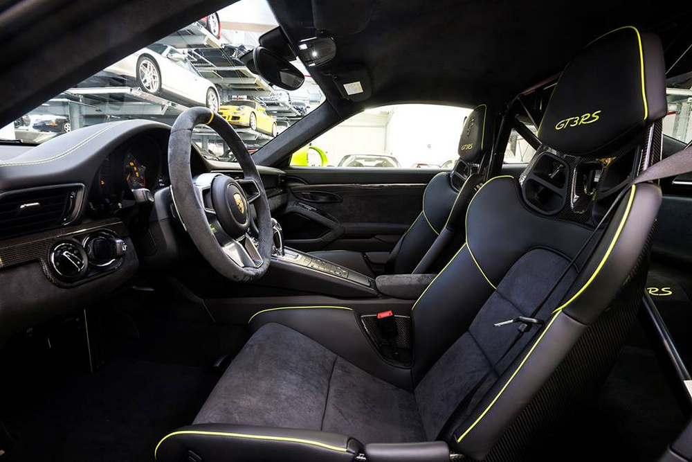 Los apliques decorativos de este Porsche 911 GT3 RS son de fibra de carbono y dispone de un volante y de una palanca de cambios tapizados en Alcántara. Cuenta también con la jaula de seguridad, que ocupa el lugar en el que en un Porsche 911 convencional encontraríamos las plazas traseras. A modo de recordatorio, decir que este modelo es considerado como el 911 definitivo, tiene un motor bóxer atmosférico de 500 CV y 460 Nm y una rapidísima caja de cambios PDK de doble embrague y siete velocidades.