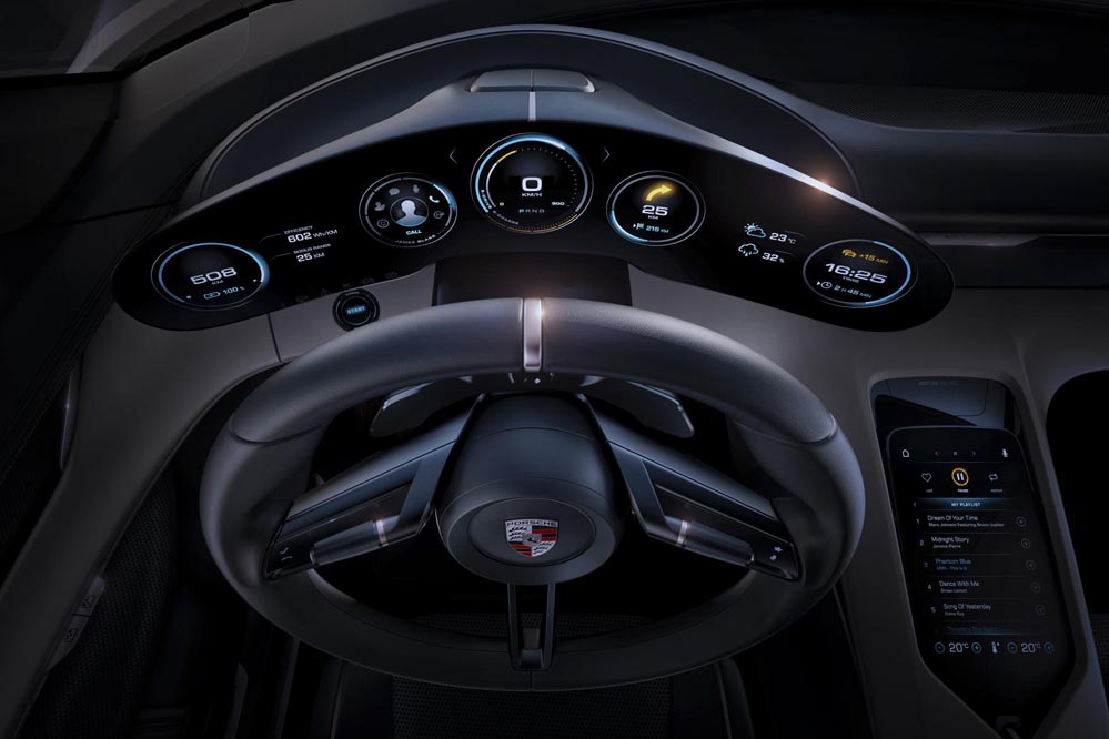 Las puertas suicidas del Porsche Mission E esconden cuatro asientos independientes que para su diseño la gente de la compañía alemana se ha inspirado en los de competición. El interior es amplio; la ausencia de túnel de transmisión ha influido a ello. El salpicadero es limpio e incorpora una pantalla LED y un cuadro de instrumentos con tecnología OLED -diodo orgánico de emisión de luz- formado por cinco esferas, algo que es ‘Made in Porsche’. Un sistema de seguimiento ocular detecta, a través de una cámara, qué instrumento está viendo el conductor con el fin de activar el menú, al que podrá acceder a él pulsando un botón del volante. Asimismo, el cuadro se mueve según la posición del asiento, por lo que siempre está a la vista y no es tapado, por ejemplo, por el aro del volante.