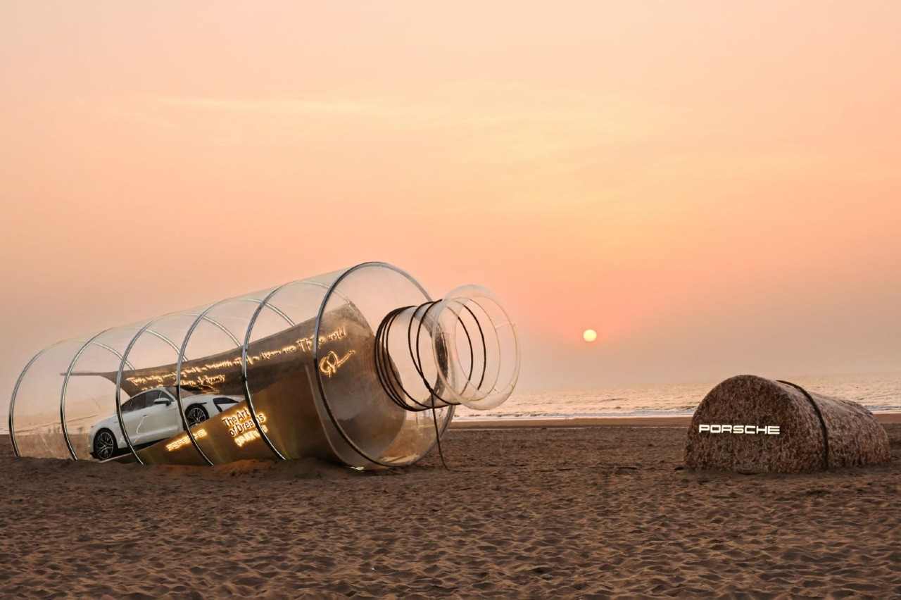 La instalación conjunta de 'Dream On' y 'Dream Capsule' celebra la historia de la marca alemana. Tiene al mencionado Taycan dentro de una gigantesca botella de cristal, pero también está envuelto en un pergamino con el primer automóvil que lleva la marca Porsche: el 356 'No. 1' Roadster - y las palabras “Aquellos que tienen la suerte de construir un negocio a partir de un sueño le deben al mundo ser los guardianes de los sueños”.