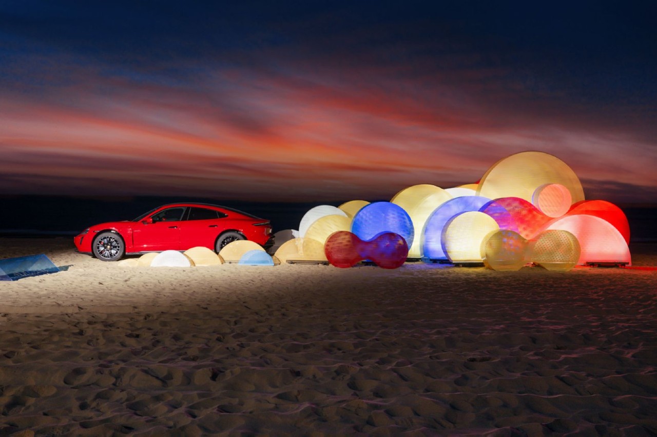 ‘Dream in Motion’ también tiene al Taycan como protagonista. Creada por Chris Labrooy, simula al eléctrico corriendo por el paseo marítimo de Aranya y creando formas geométricas coloridas para representan la arena y el polvo que se levantan al pasar el vehículo.