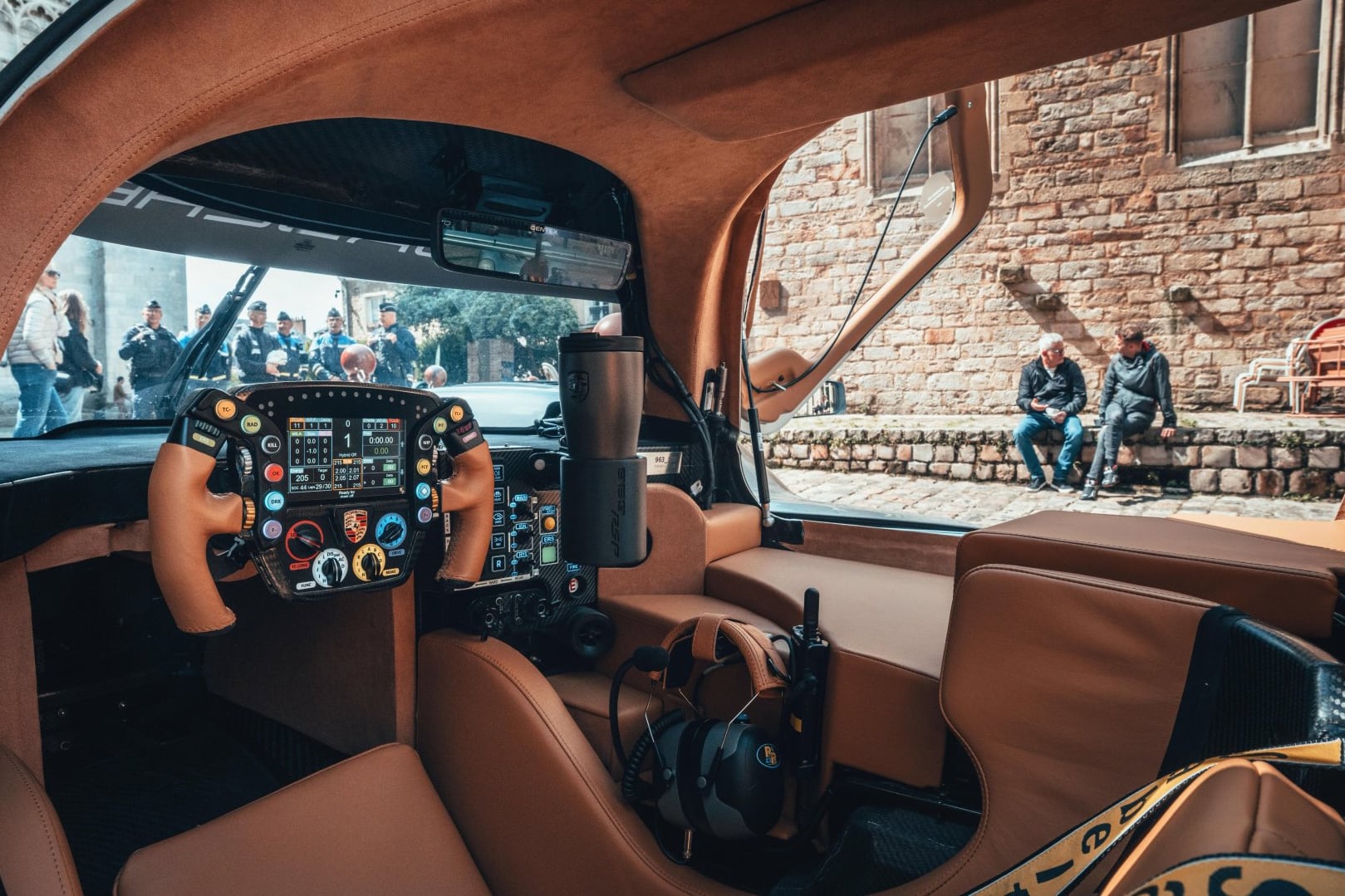 El interior es mucho más refinado al adoptar tapicería de cuero marrón claro y Alcantara -apoyos para las piernas, el techo y los pilares A están tapizados en piel vuelta-, inspirado en los materiales que el conde Rossi eligió hace 50 años, y como no tiene por qué llevar todo el equipo de seguridad, es "mucho más cómodo", como ha declarado Timo Bernhard después de bajarse del Porsche 963 RSP.