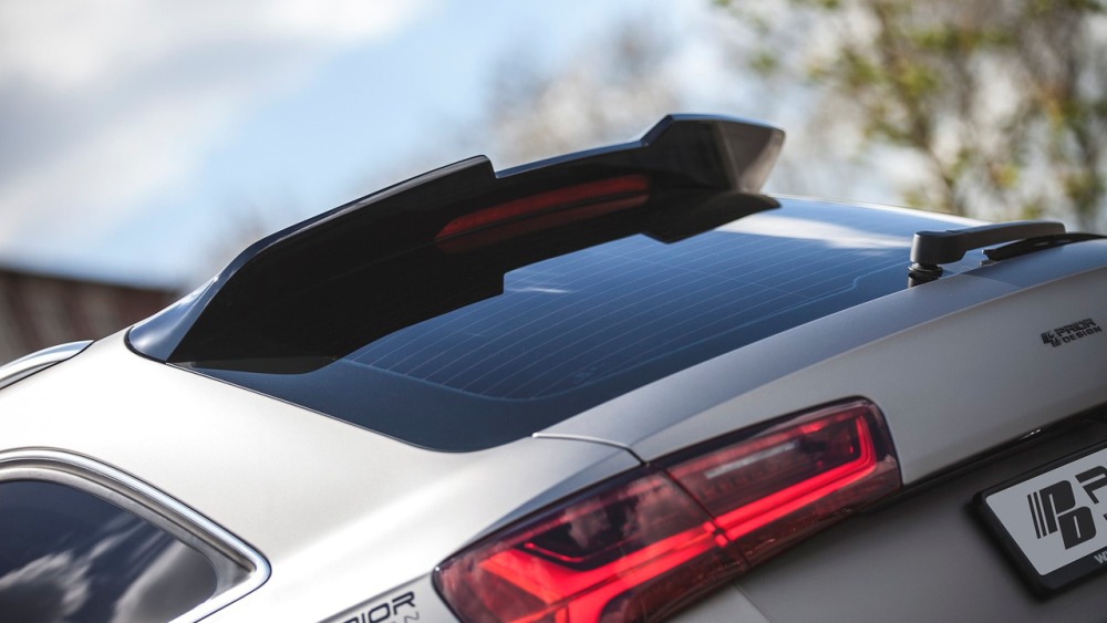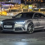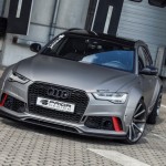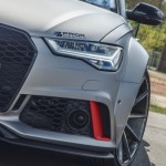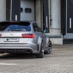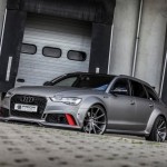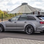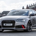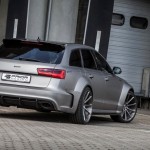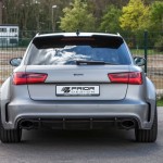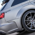 El kit de carrocería del Audi RS6 Avant estrena parachoques delantero y trasero, taloneas laterales, pasos de rueda más anchos y un alerón prominente sobre el techo. Además, el difusor sobresale ahora incluso más. Una vez instalado el paquete aerodinámico completo, el RS6 Avant crece hasta 8 centímetros de anchura en el tren delantero y 10 centímetros en el posterior.