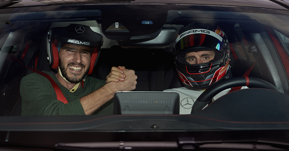 El siguiente paso tampoco era sencillo: tenían que ‘tejer’ esas imágenes para que fueran encajando con la pista del trazado madrileño a medida que el coche, el Clase A más potente, fuera moviéndose por el circuito. La sesión comenzó con un par de vueltas rápidas a bordo de un A 45 con un invitado de excepción al volante, Daniel Juncadella, piloto del equipo del DTM de Mercedes-AMG. Nadie mejor que él para demostrar las capacidades de este compacto radical, que incluso con asfalto húmedo y frío, no tiene dificultades para rodar a ritmo endiablado (especialmente con Dani al volante).