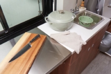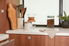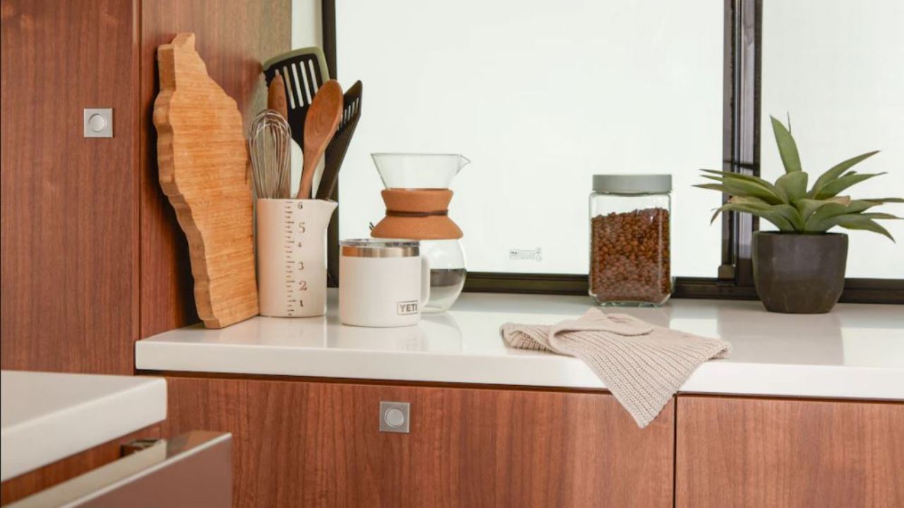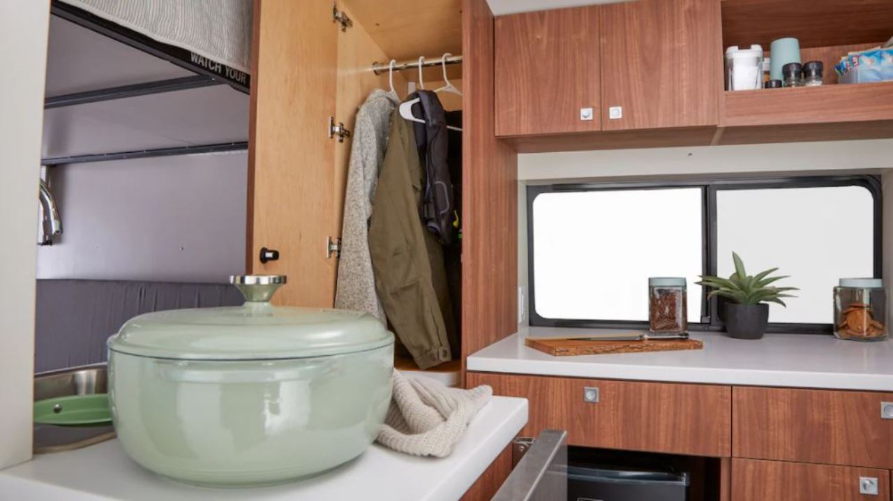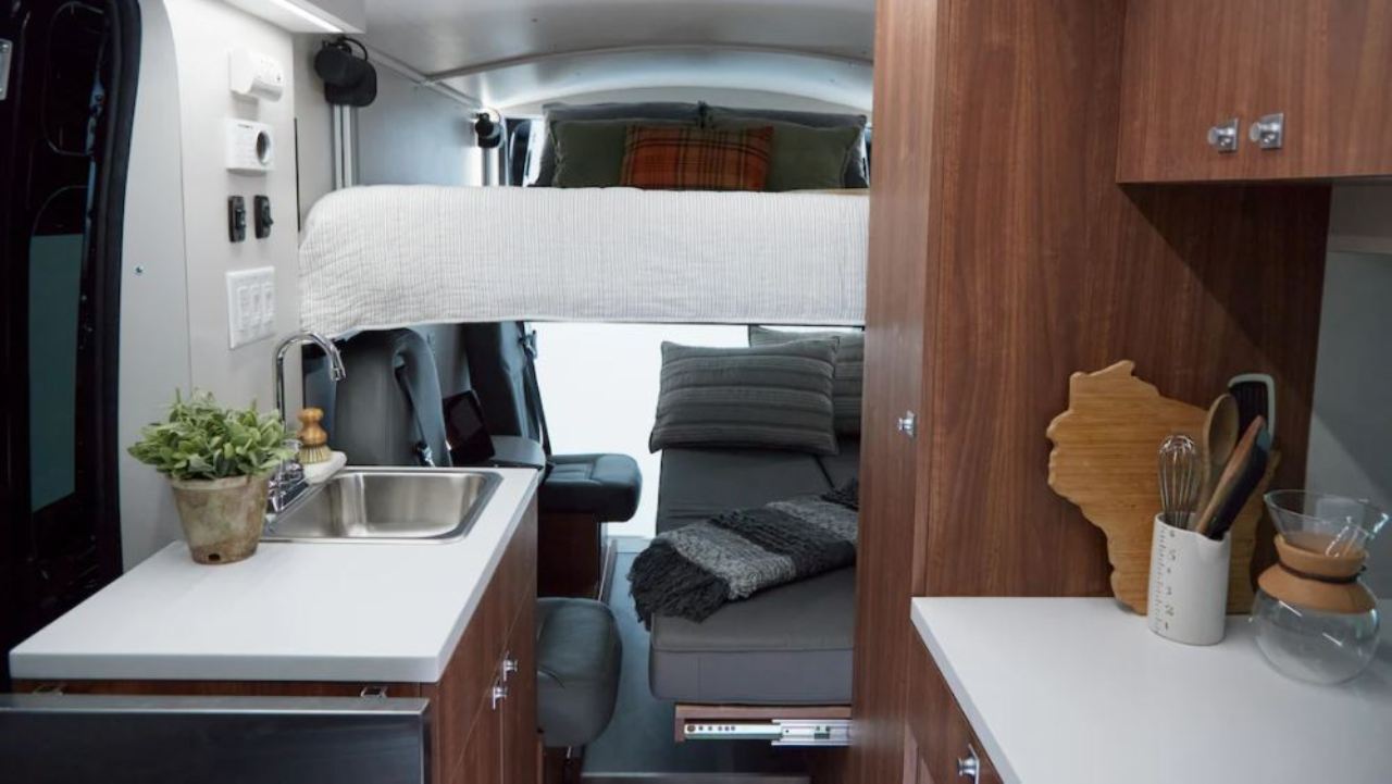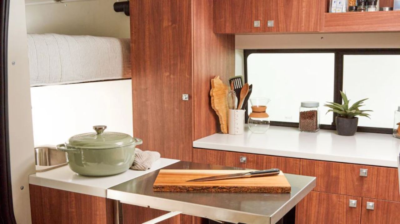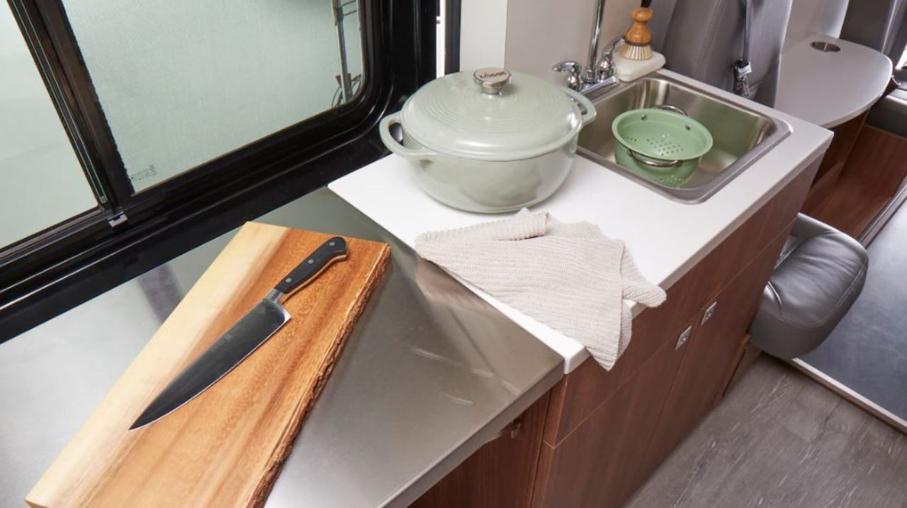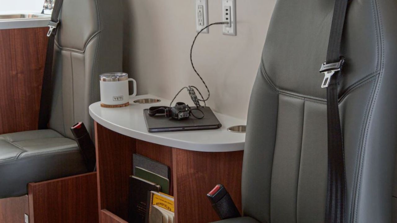 Otras características del interior es un sofá de banco que también se convierte en cama y permite almacenar objetos debajo en tres cajones extraíbles. También hay dos sillas con cinturones de seguridad, cubículos de almacenamiento debajo de los asientos, una mesa completa con soporte para bebidas, un inodoro estilo “cassette” y una bandeja de accesorios deslizable que permite cargar objetos voluminosos o emplearse como mesa de picnic.