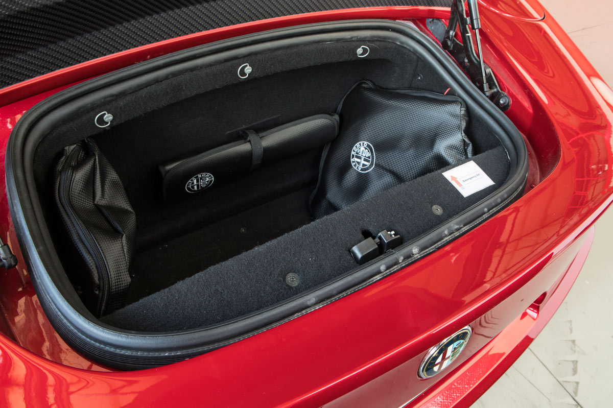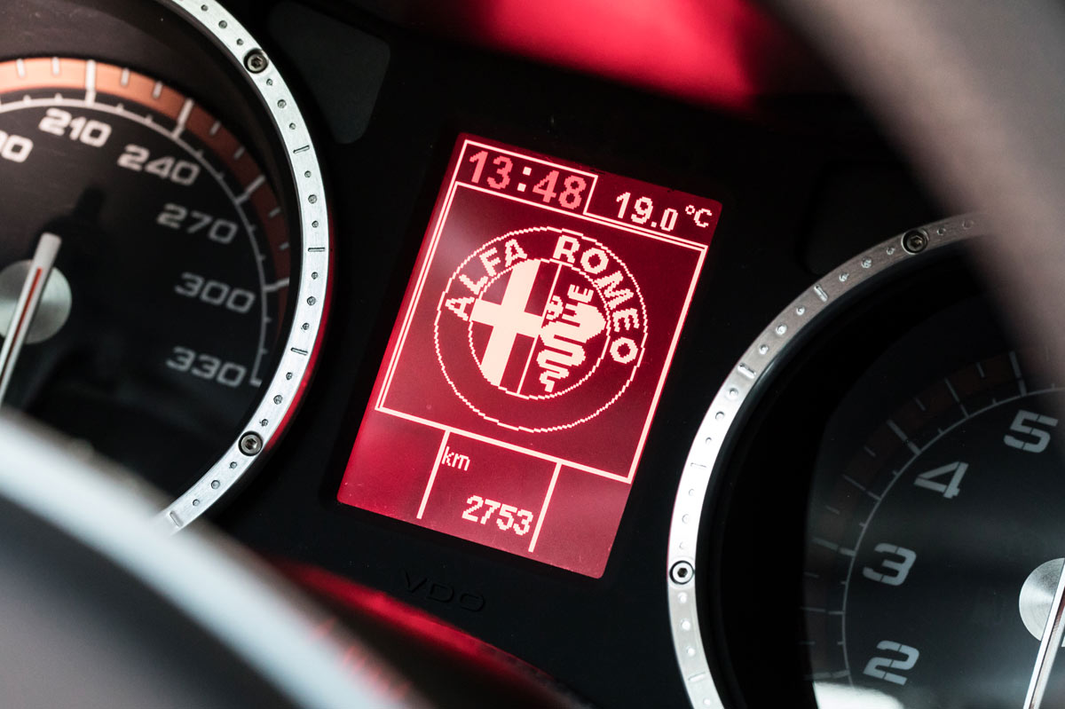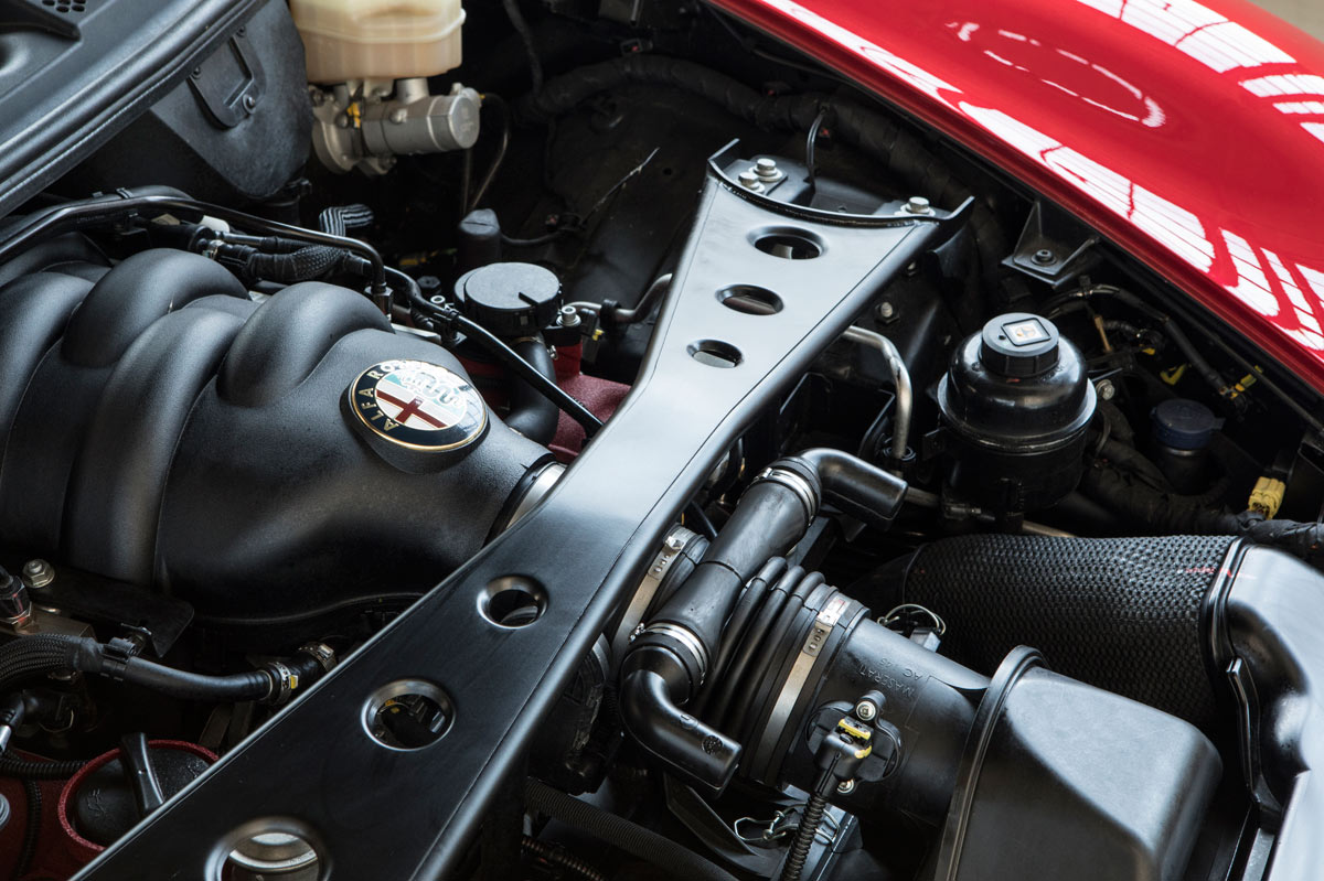Hay más alegrías bajo el capó. El motor V8 a 90º, fabricado por Ferrari para Alfa y Maserati, está situado en la parte central delantera, con propulsión trasera y un perfecto reparto de pesos del 50 por ciento entre ambos ejes. Con 450 CV de potencia, cubica 4,7 litros y acelera de 0 a 100 km/h en 4,5 segundos, alcanzando 300 km/h de velocidad punta. Como buen propulsor Ferrari, entre las dos tapas de balancines rojas destacan dos tubos de admisión negros.