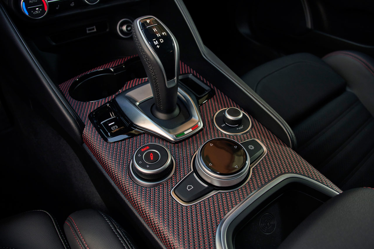 Abro la puerta y me encuentro otro elemento diferenciador que me parece un acierto: la consola y parte del salpicadero acogen fibra de carbono en rojo. Con él aumenta tanto la exclusividad como la deportividad. También es único el bordado de los reposacabezas, que al logo de Alfa Romeo -aquí te cuento su curiosa historia- se suman las palabras Super Sport y el número de la unidad limitada.