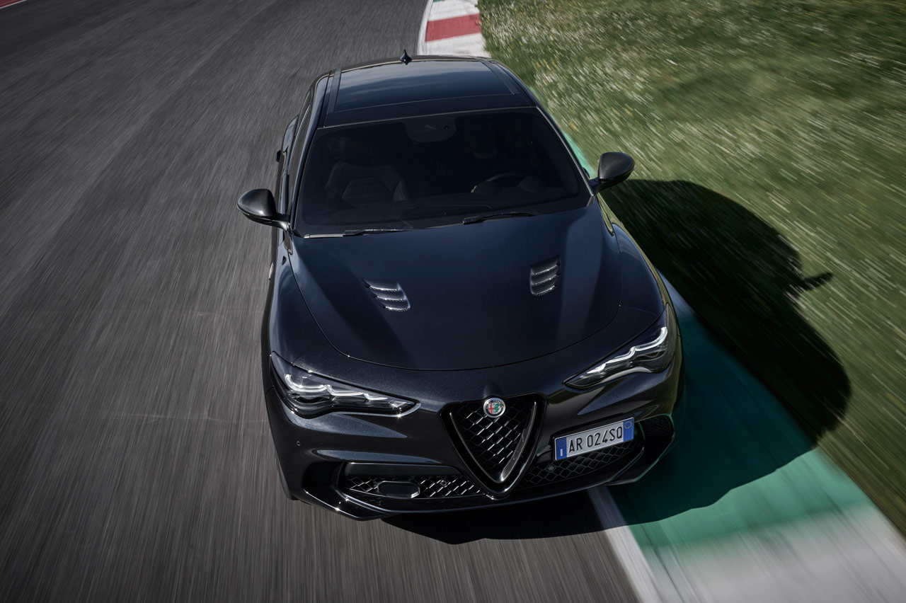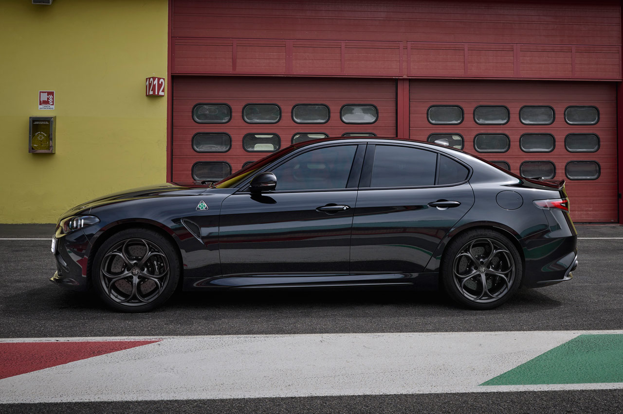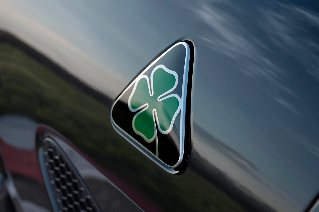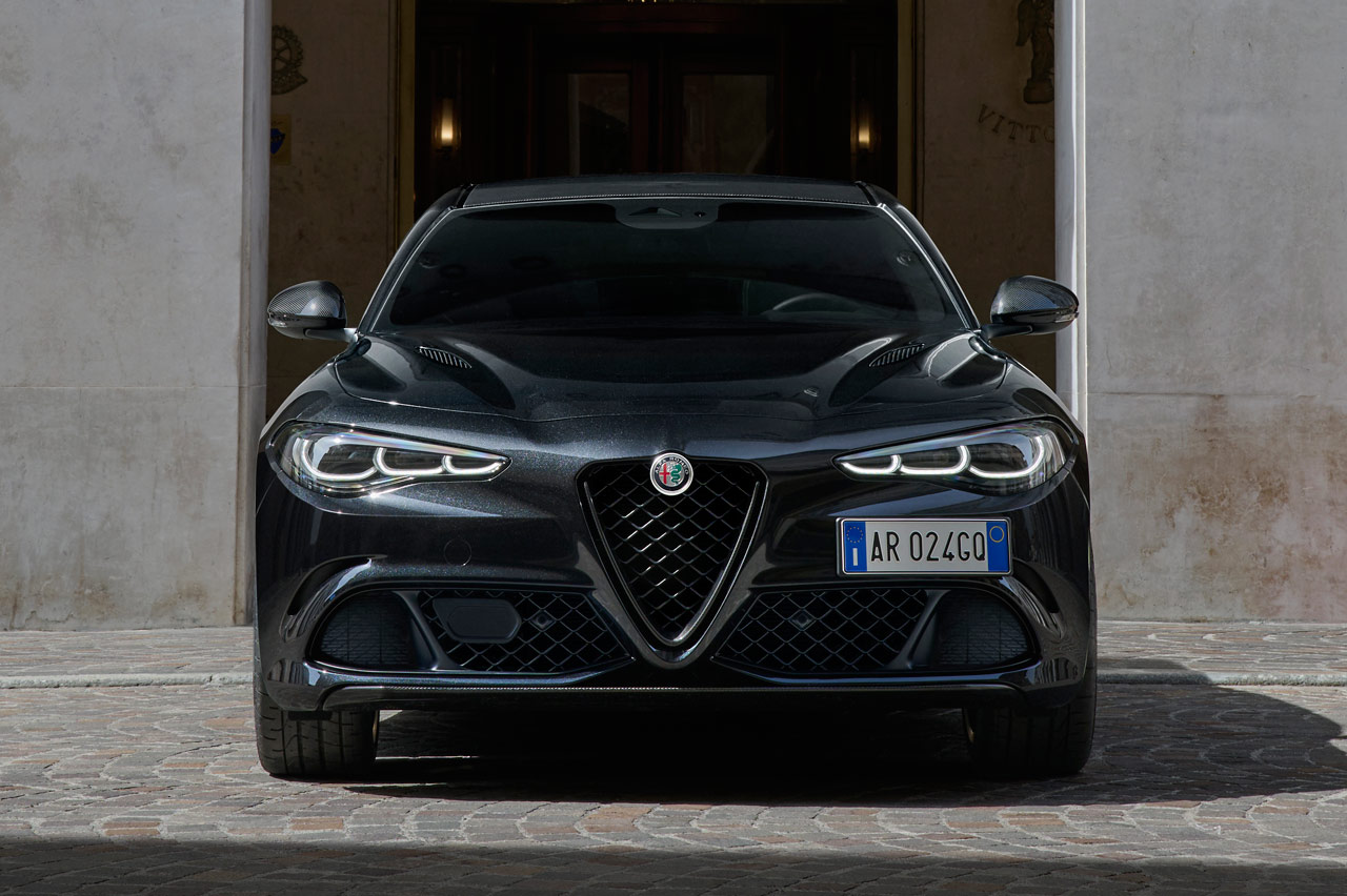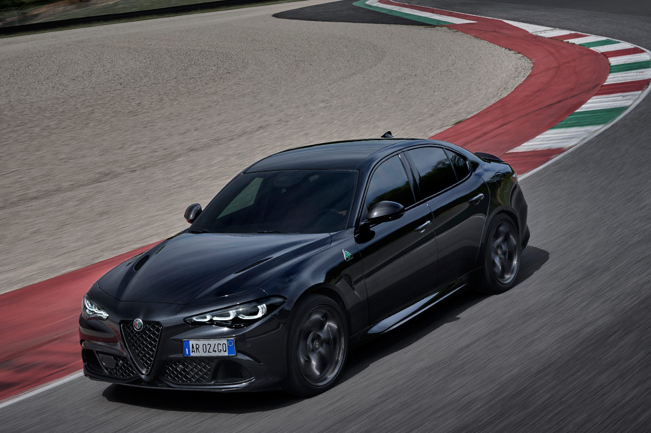 Su carrocería puede ir bañada en blanco (Alfa White 2024), negro (Volcano Black) o rojo (Red Etna) y podrás diferenciarlo a primera vista porque el logotipo del Quadrifoglio, por primera vez en sus 101 años de historia, va sobre un fondo negro -sí que hubo un Quadrifoglio d’Oro-. Mismo color de las pinzas de freno, sus preciosas llantas de aleación y el nombre del modelo.
