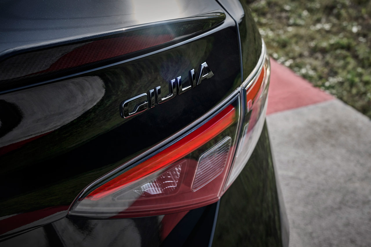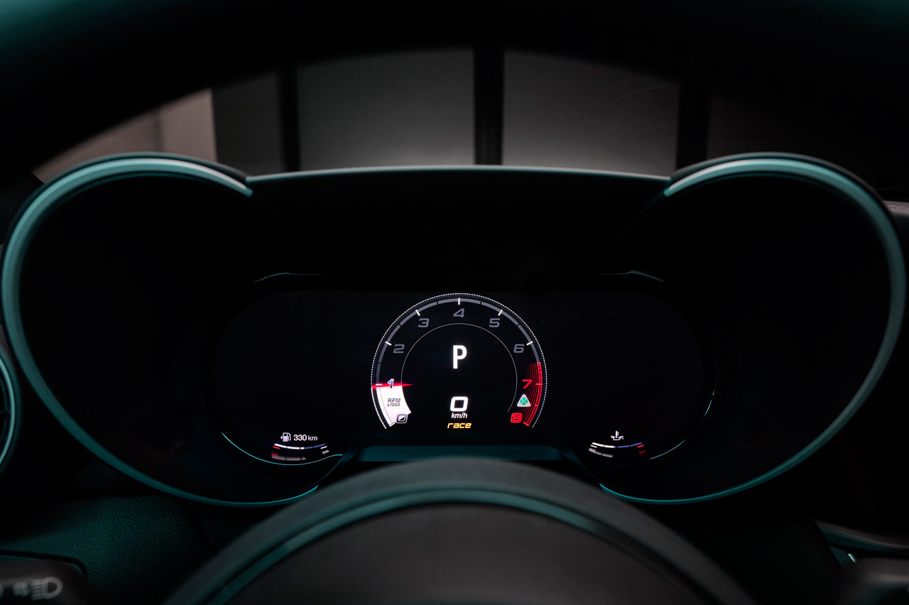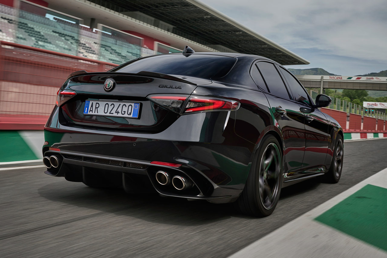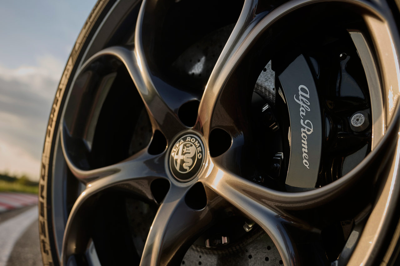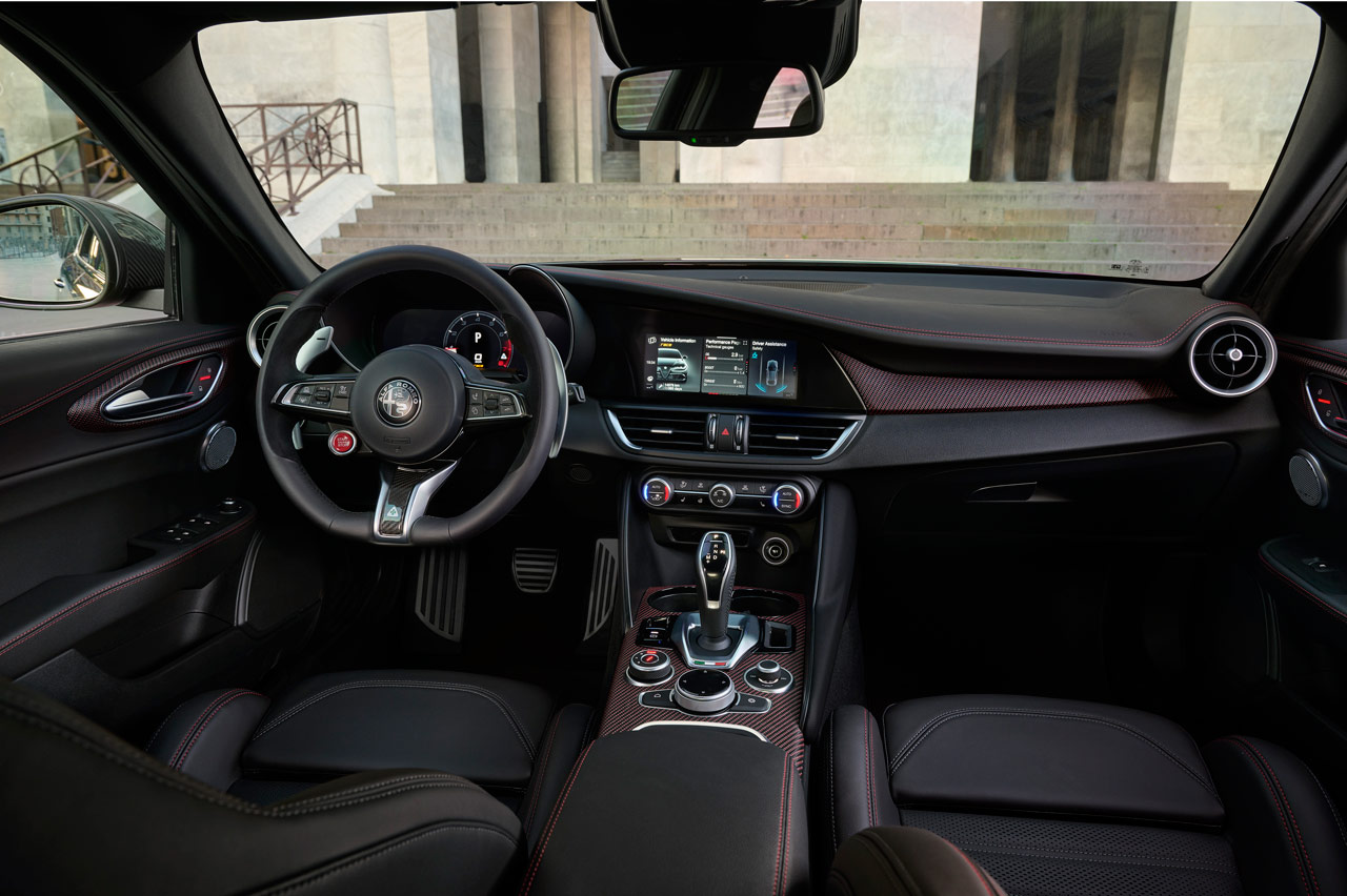 Su carrocería puede ir bañada en blanco (Alfa White 2024), negro (Volcano Black) o rojo (Red Etna) y podrás diferenciarlo a primera vista porque el logotipo del Quadrifoglio, por primera vez en sus 101 años de historia, va sobre un fondo negro -sí que hubo un Quadrifoglio d’Oro-. Mismo color de las pinzas de freno, sus preciosas llantas de aleación y el nombre del modelo.
