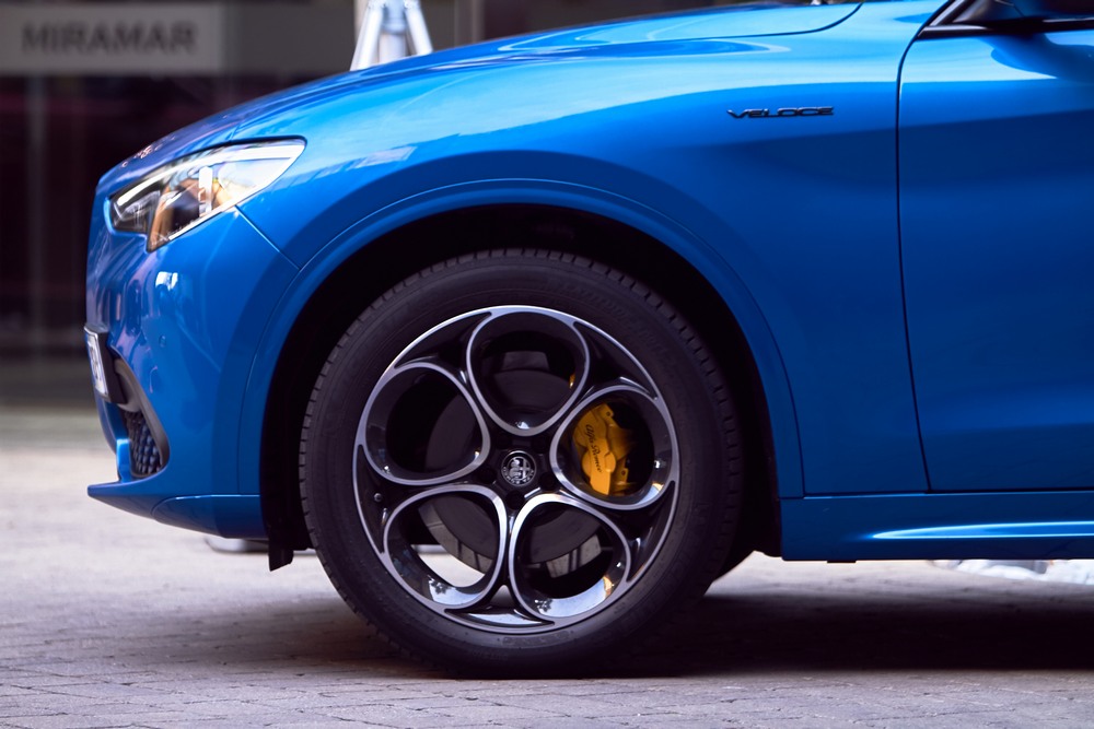 El tope de la gama, al menos hasta que llegue el Stelvio Quadrifoglio, es el Alfa Romeo Stelvio Veloce. Luce detalles estéticos exclusivos, como una carrocería pintada por completo en el mismo color, incluyendo elementos como los pasos de rueda o faldones laterales (hasta ahora esto solo se daba en el mencionado Quadrifoglio); unas llantas de aleación de 20 pulgadas; y un interior con elementos deportivos, como el volante o los asientos deportivos de cuero con ajuste eléctrico y calefactables.