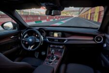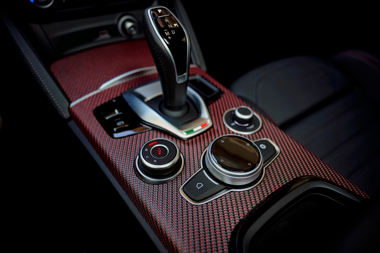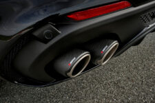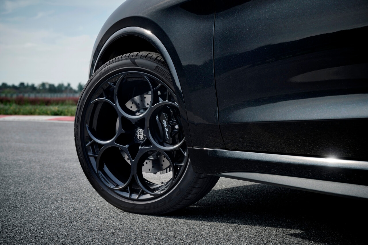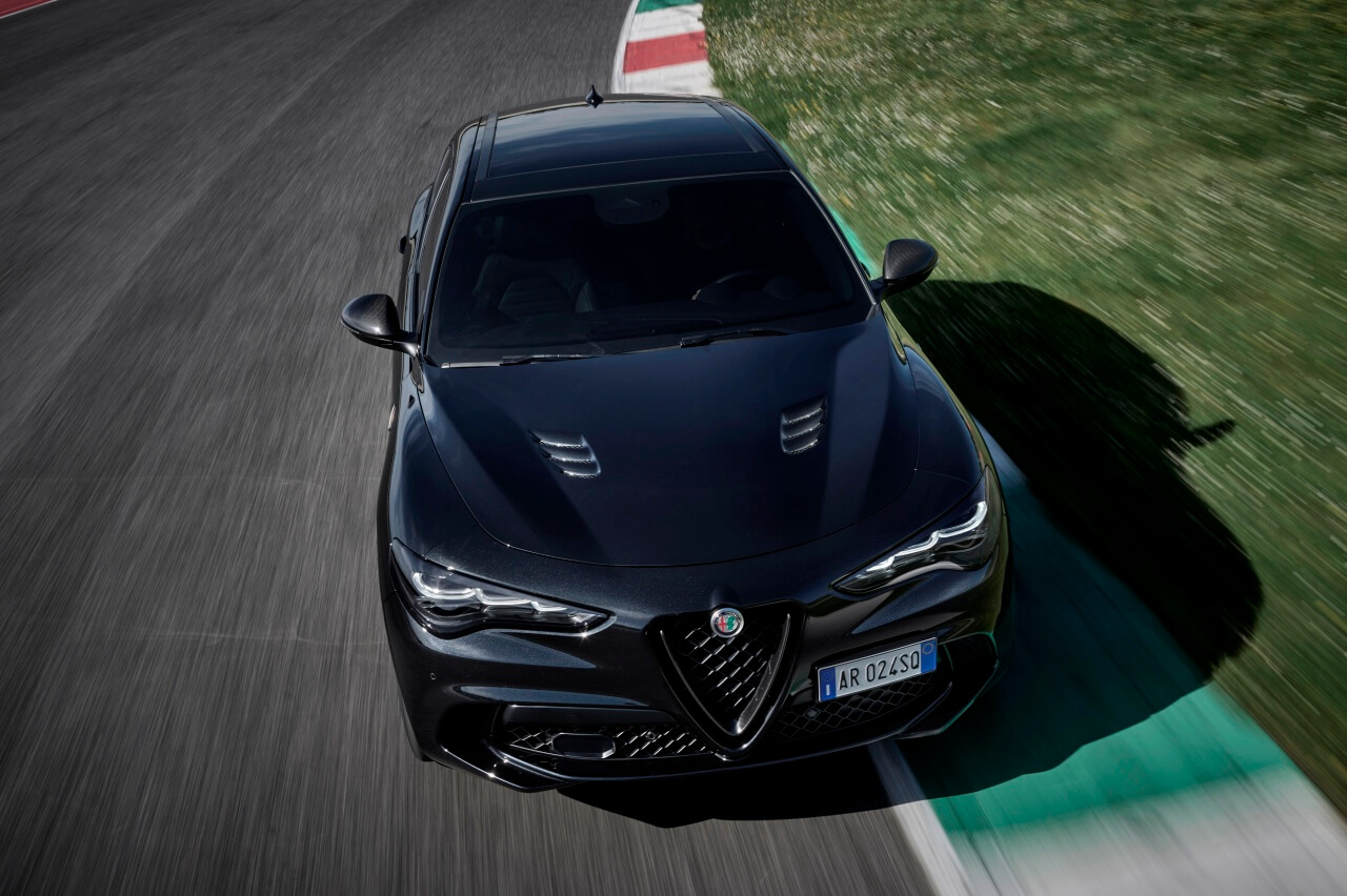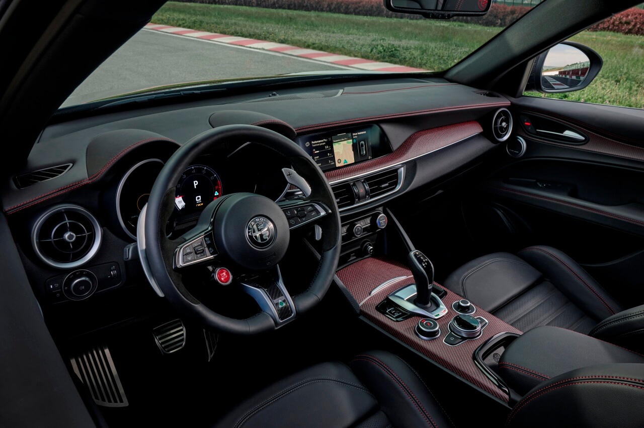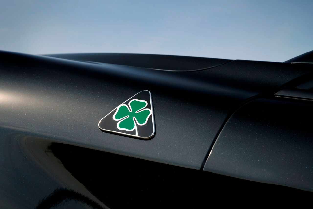 Por fuera se distingue por el fondo del trébol en diferente color y porque las pinzas de freno, las preciosas llantas de aleación y el nombre del modelo van bañados en negro. El borde de la calandra está realizado en fibra de carbono, y la carrocería puede ir pintada en Vulcano Black o Red Etna -no en Alfa White 2024, como el Alfa Romeo Giulia (prueba)-.