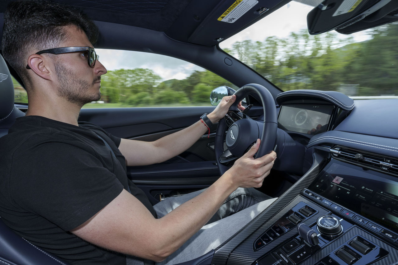 Junto a esto, otra cosa con la que me tengo que familiarizar es la propia anchura del coche. Si lo comparamos con su predecesor, el DB12 tiene 6 mm más de ancho de vía delante y 22 mm más detrás. En las carreteras estrechas que encuentro al principio, esto me pone un poco tenso, ya que no quiero crear ningún desperfecto. Por suerte, pronto se abre la vía.