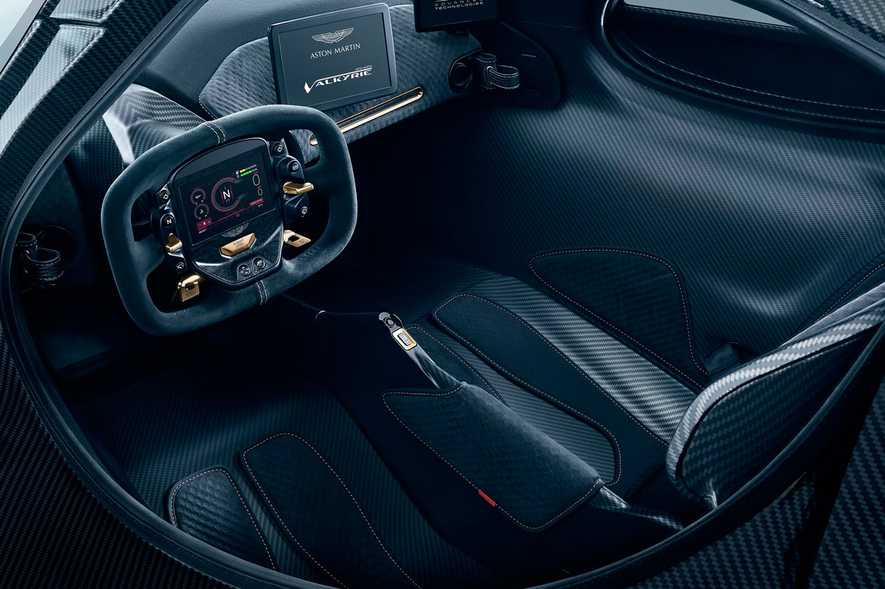 De vez en cuando tengo que recordar que el Aston Martin Valkyrie también es un coche diseñado y homologado para la vía pública. Te prometo que dentro de poco verás uno subido a Instagram desde las calles de Knightsbridge o posando en Nueva York. Tiene espacio para llevar matrículas, un par de espejos retrovisores (compuesto por unas aerodinámicas cámaras), intermitentes y un imprescindible sistema para elevar la suspensión de ambos ejes necesario para poder superar los típicos badenes.