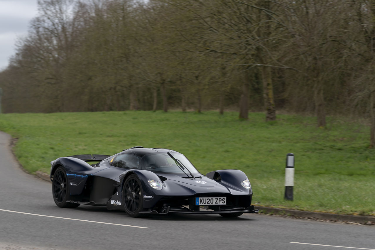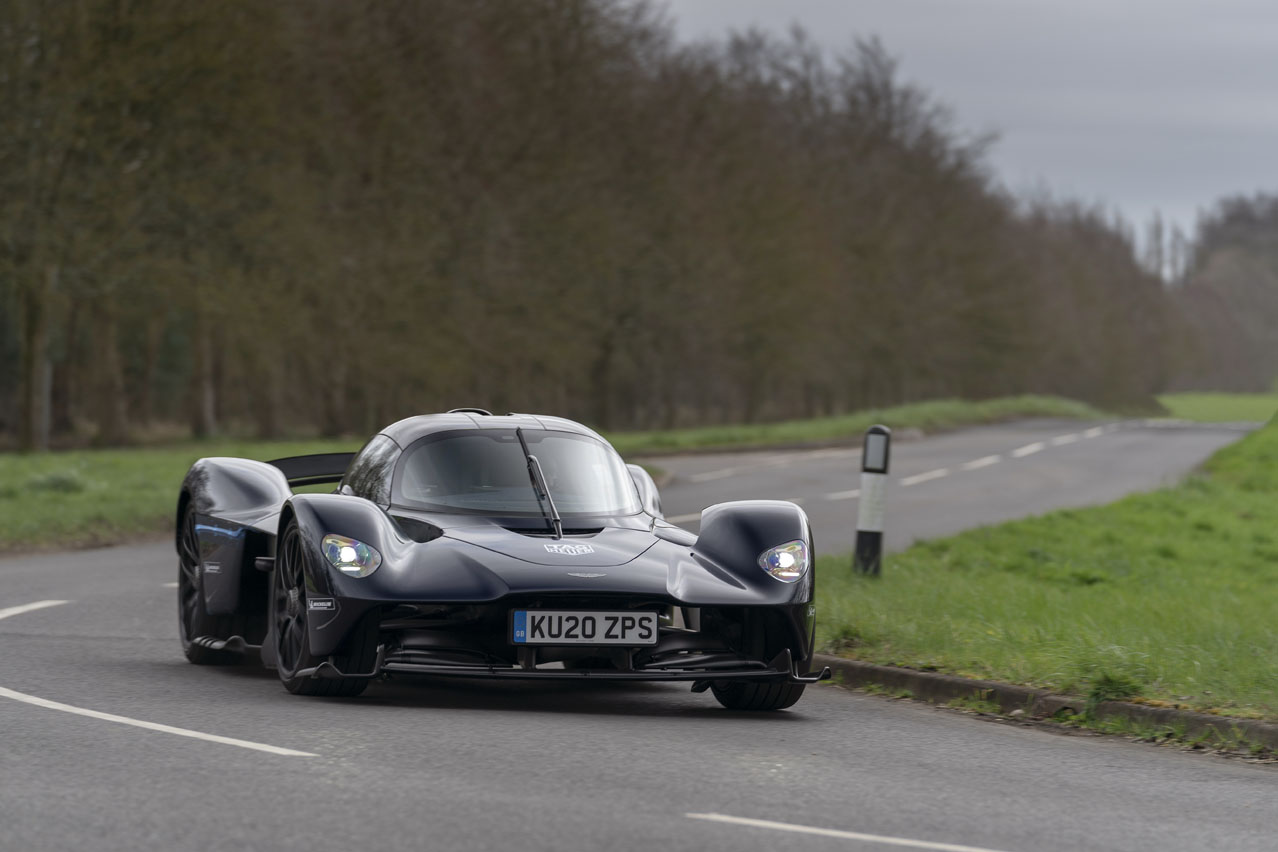 El motor Cosworth V12 de 6,5 litros atmosférico aúlla cuando reduzco a una marcha inferior en el modo Track, la más dinámica de las tres configuraciones. No hay un botón D para cambiar de forma automática en un Valkyrie de 1.155 CV: cada inserción de la caja de cambios secuencial de siete velocidades de un solo embrague especialmente desarrollada se tiene que realizar a través de las levas de cambio.