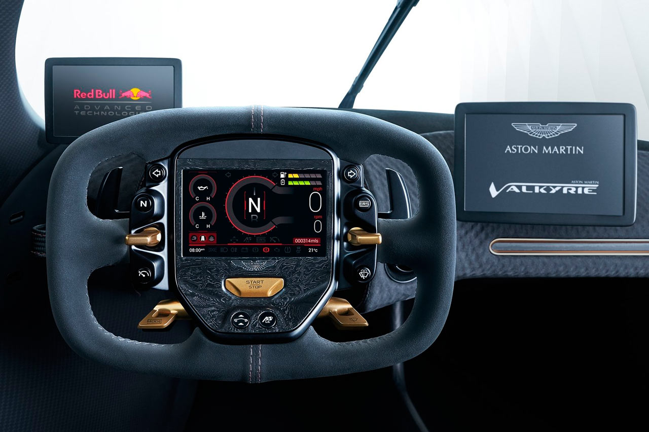Con más tiempo y práctica, debería poder ubicar el botón KERS en el volante desmontable de Aston Martin Valkyrie sin pensarlo dos veces. La versión de carretera del primer hipercoche de Aston Martin cuenta con un sistema de recuperación de energía cinética, igual que un Fórmula 1.