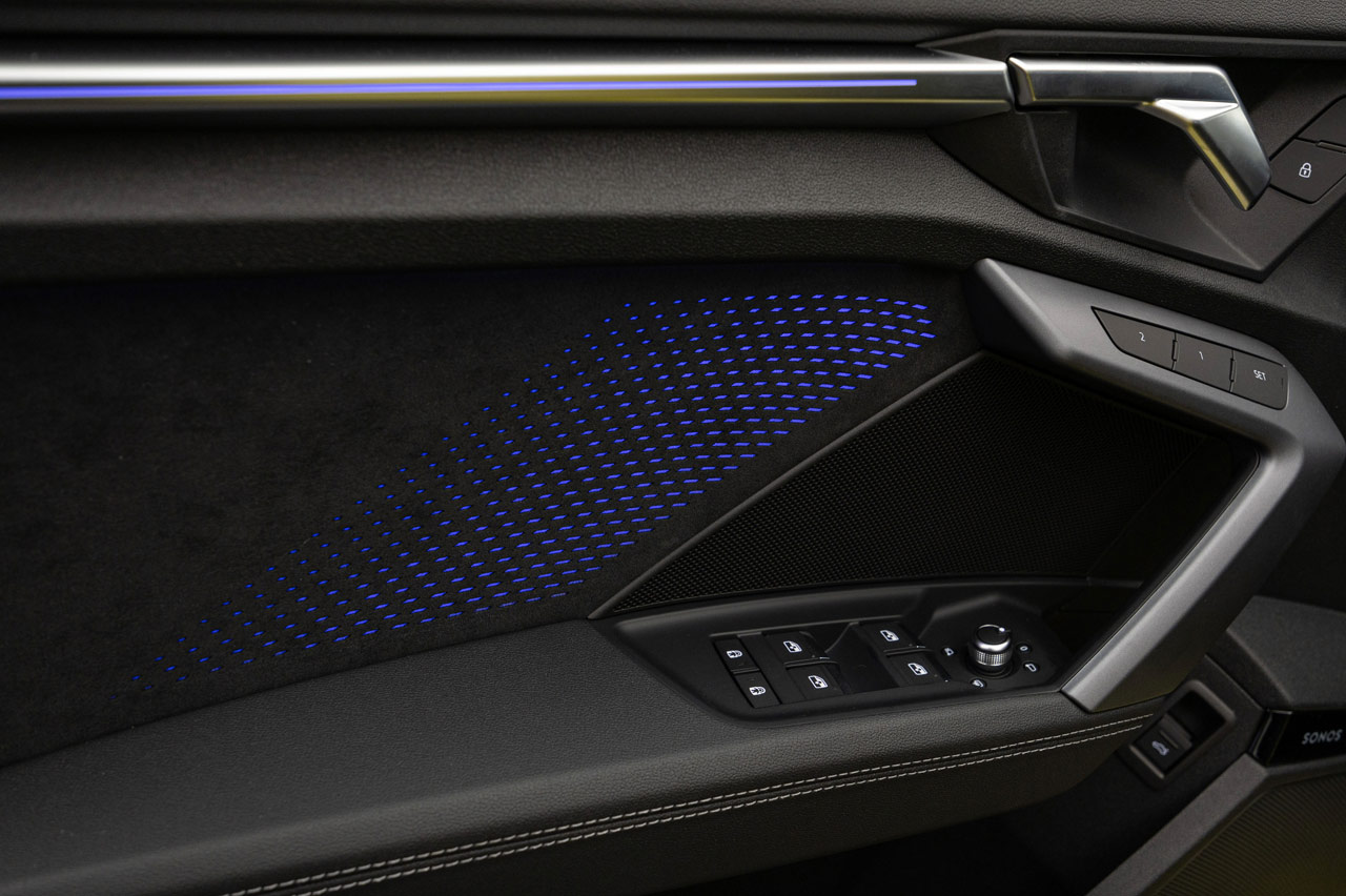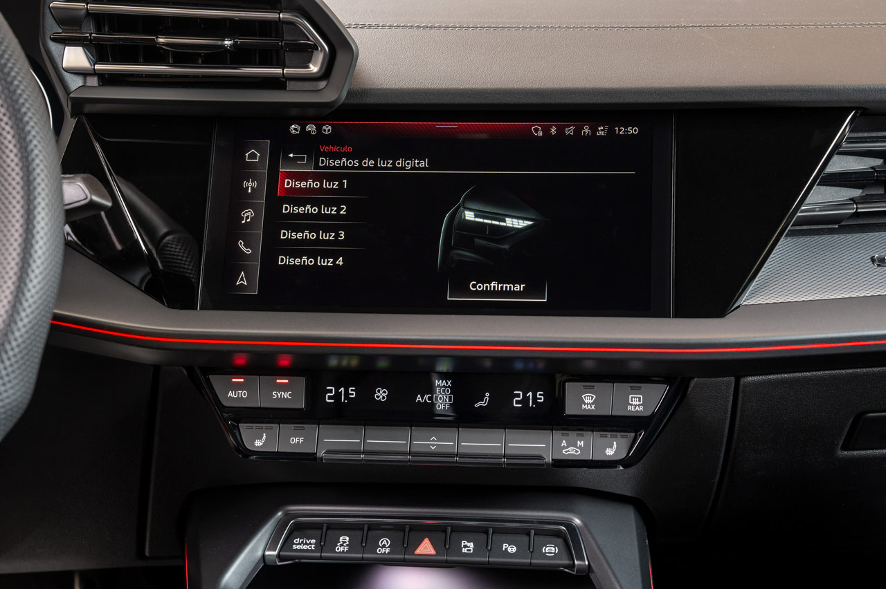 Sí es nueva la zona inferior de la consola, que ahora acoge un pequeño selector del cambio automático S tronic, que sustituye a la palanca; con él no se puede subir y bajar de marchas, pero para eso tienes las levas del volante. También las inserciones decorativas de tela y la iluminación ambiental, que es de serie. La luz ambiental plus, con la que se ilumina la consola y los bordes de los reposavasos también lo es, pero con los acabados S line y Black line. Y luego está el paquete opcional de luz ambiental pro, con el que el revestimiento textil con 300 perforaciones de los paneles de las puertas se iluminan con hasta 30 colores.